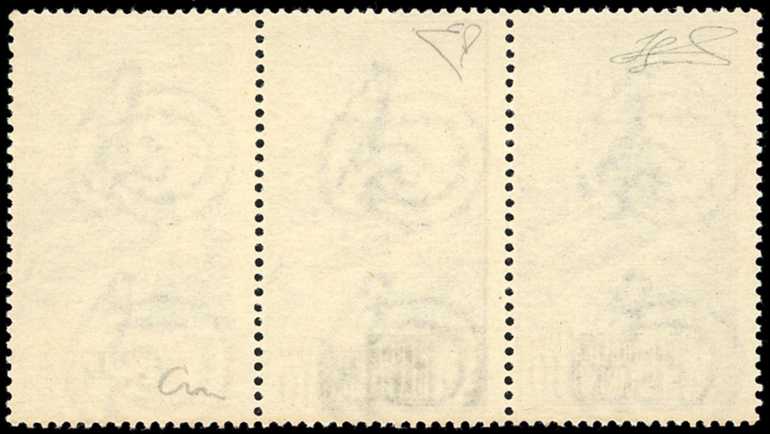 1949 - 10 lire Paesaggi (349), striscia orizzontale di tre, il secondo esemplare con parte della stampa del nero spostata in basso, il terzo con la stampa del nero fortemente evanescente, gomma originale integra, perfetta. Molto rara e non catalogata. E.Diena, Ferrario.