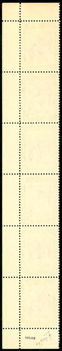 1949 - 1 lira Giornata Filatelica, striscia verticale di sei esemplari con soprastampa fortemente spostata in basso che ha originato le ... Leggi tutto