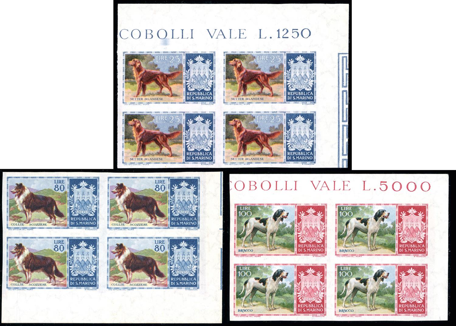 1956 - 25 lire, 80 lire, 100 lire Cani (445,447,448), non dentellati, blocchi di quattro, angolo di foglio, gomma originale integra, leggermente bicolore per l'80 lire, perfetti. Cert. Savarese Oliva 1973.