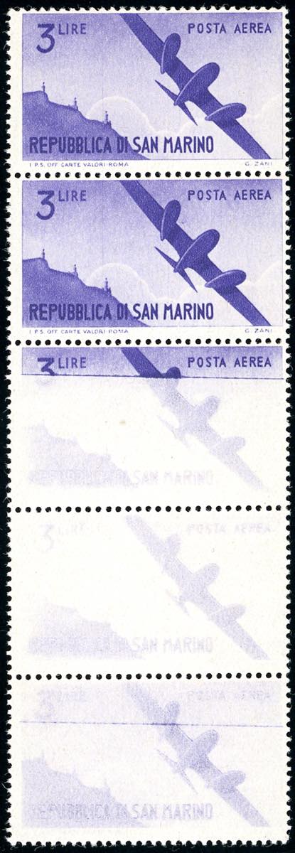 1946 - 3 lire Vedute (54), striscia verticale di cinque, tre esemplari con stampa fortemente evanescente, gomma originale integra, perfetta. D'effetto. Ferrario.