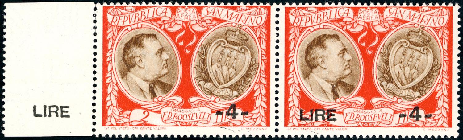 1947 - 4 lire su 2 lire Roosvelt soprastampato, coppia orizzontale, un esemplare con la soprastampa della sola cifra "4", l'altro con la soprastampa "LIRE 4" a causa dello spostamento (70ha,70g), bordo di foglio con la soprastampa "LIRE", gomma integra, perfetta. Ferrario, Raybaudi per esteso.