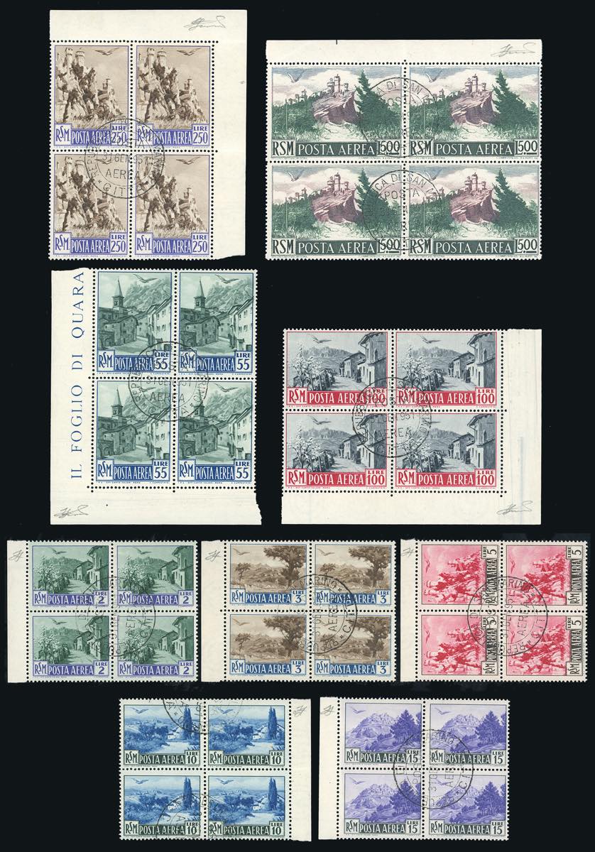 1950 - Veduta, serie completa (83/91), blocchi di quattro, bordo/angolo di foglio, usati, perfetti. Rari. Cert. Ferrario per gli alti ... Leggi tutto