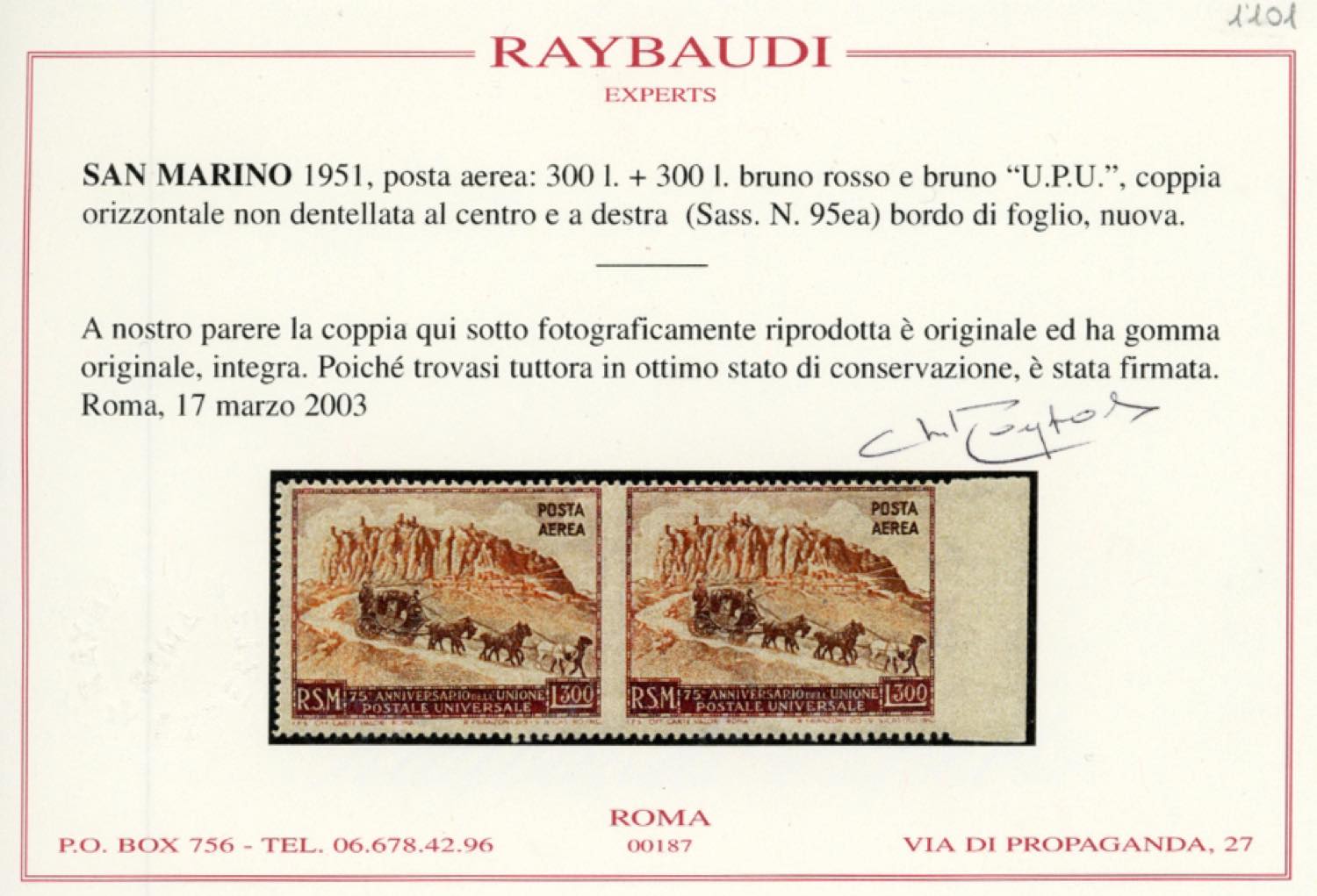 1951 - 300 lire UPU, coppia orizzontale, non dentellata al centro e a destra (95ea), bordo di foglio, gomma originale integra, perfetta. Rara e molto bella. Cert. Raybaudi.