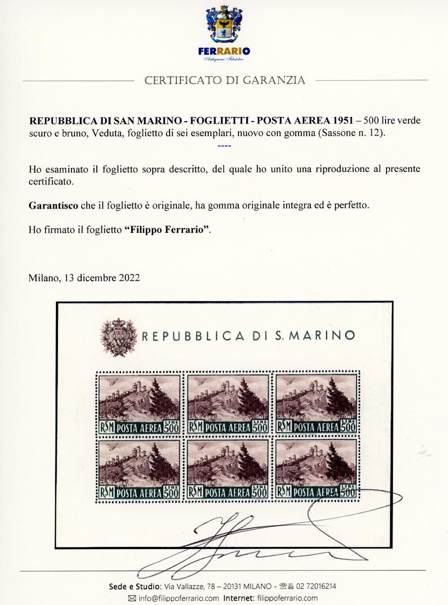 1951 - 500 lire Veduta, foglietto (12), gomma originale integra, perfetto. Splendido! Cert. Ferrario.