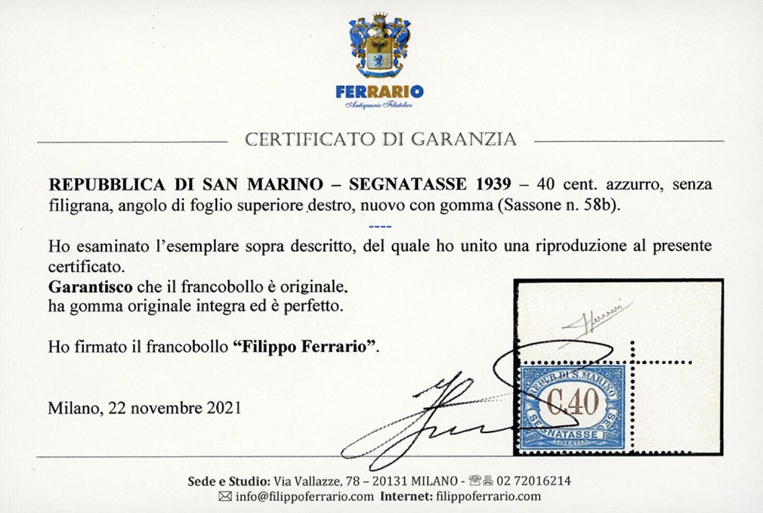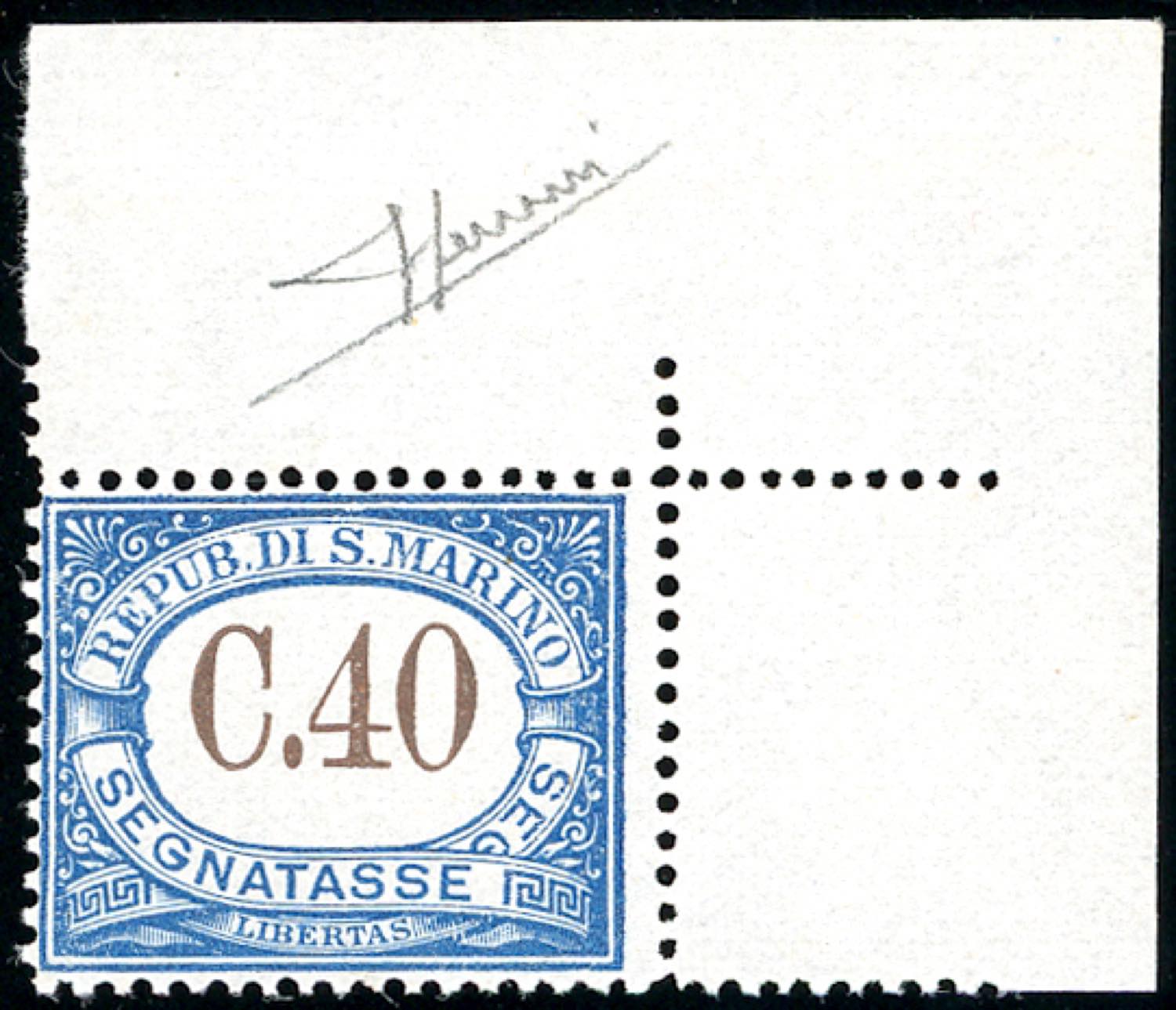 1939 - 40 cent., senza filigrana (58b), angolo di foglio, gomma originale integra, perfetto. Splendido e raro. Sorani, cert. Ferrario.