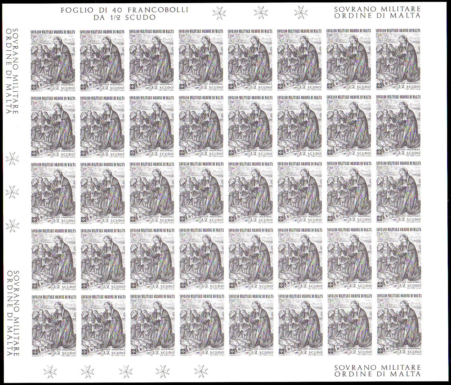 1969 - Natale, fogli completi di 40 esemplari, non dentellati e tutti senza filigrana (47/49 nota), senza gomma, come sempre, perfetti. Bella e rara varietà, non catalogata.