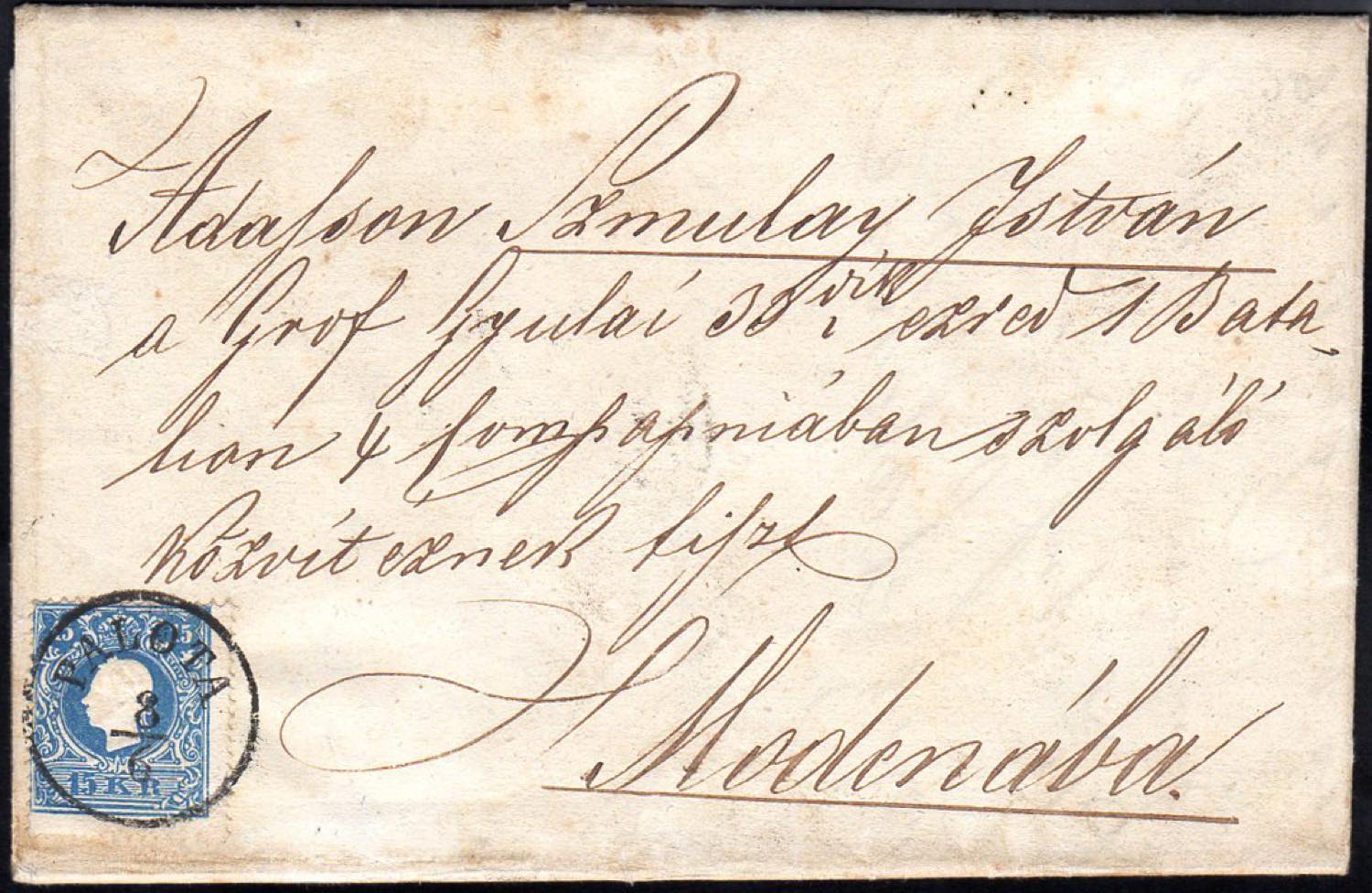 AUSTRIA 1859 - 15 k. azzurro, II tipo (16), perfetto, su lettera da Palota 8/6/1859 a Modena. Destinazione non comune.