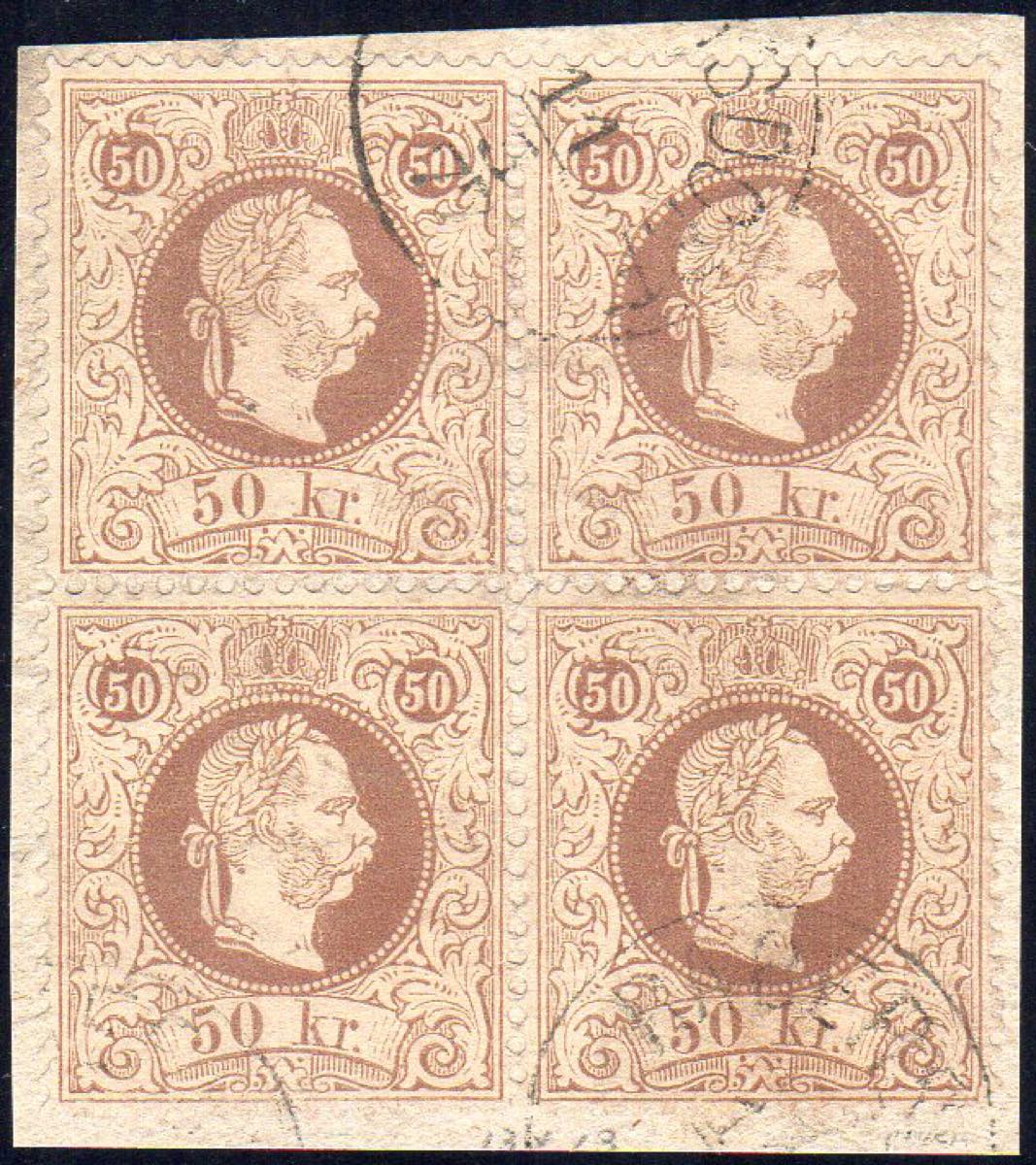 AUSTRIA 1874 - 50 k. Francesco Giuseppe, stampa fine, dent. 12 (Ferch.41/II), blocco di quattro, usato, perfetto.