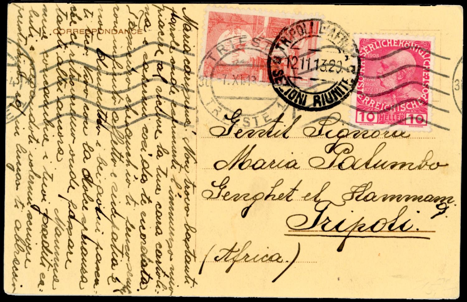 AUSTRIA 1913 - 10 h. Francesco Giuseppe (106), e 10 cent. erinnofilo Lega Nazionale, perfetti, su cartolina da Trieste 7/11/1913 a Tripoli, bolla d'arrivo.