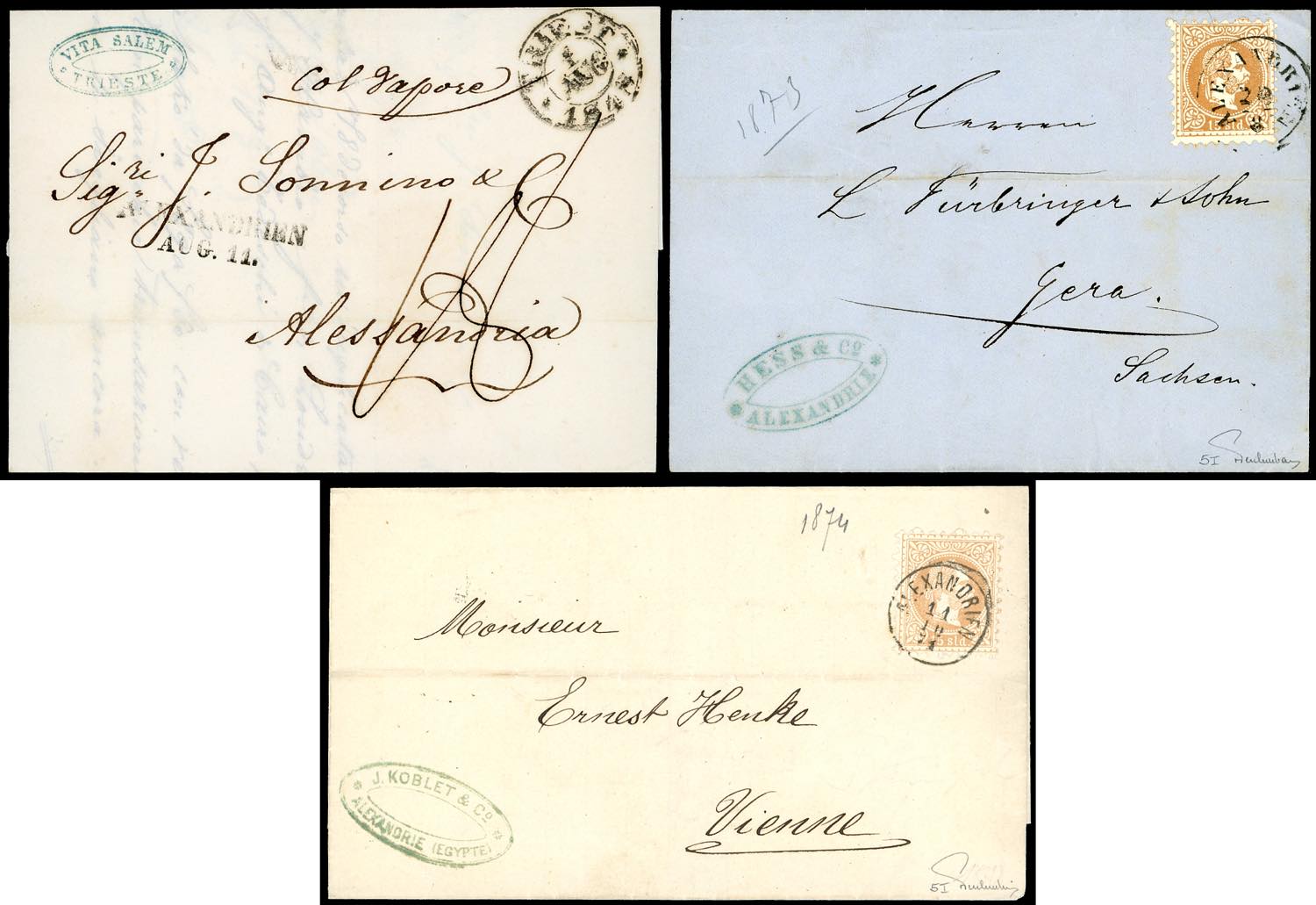 AUSTRIA LEVANTE 1848/73 - 15 soldi (36), perfetto, due lettere dall'Ufficio postale austriaco di Alessandria d'Egitto, una del 29/8/1873 per Gera, Sassonia; l'altra dell'11/10/1871 per Vienna, entrambe di ottima qualità e firmate Ferchenbauer. Allegata una lettera prefilatelica da Trieste 1/8/1848 ad Alessandria, con il lineare Alexandrien.