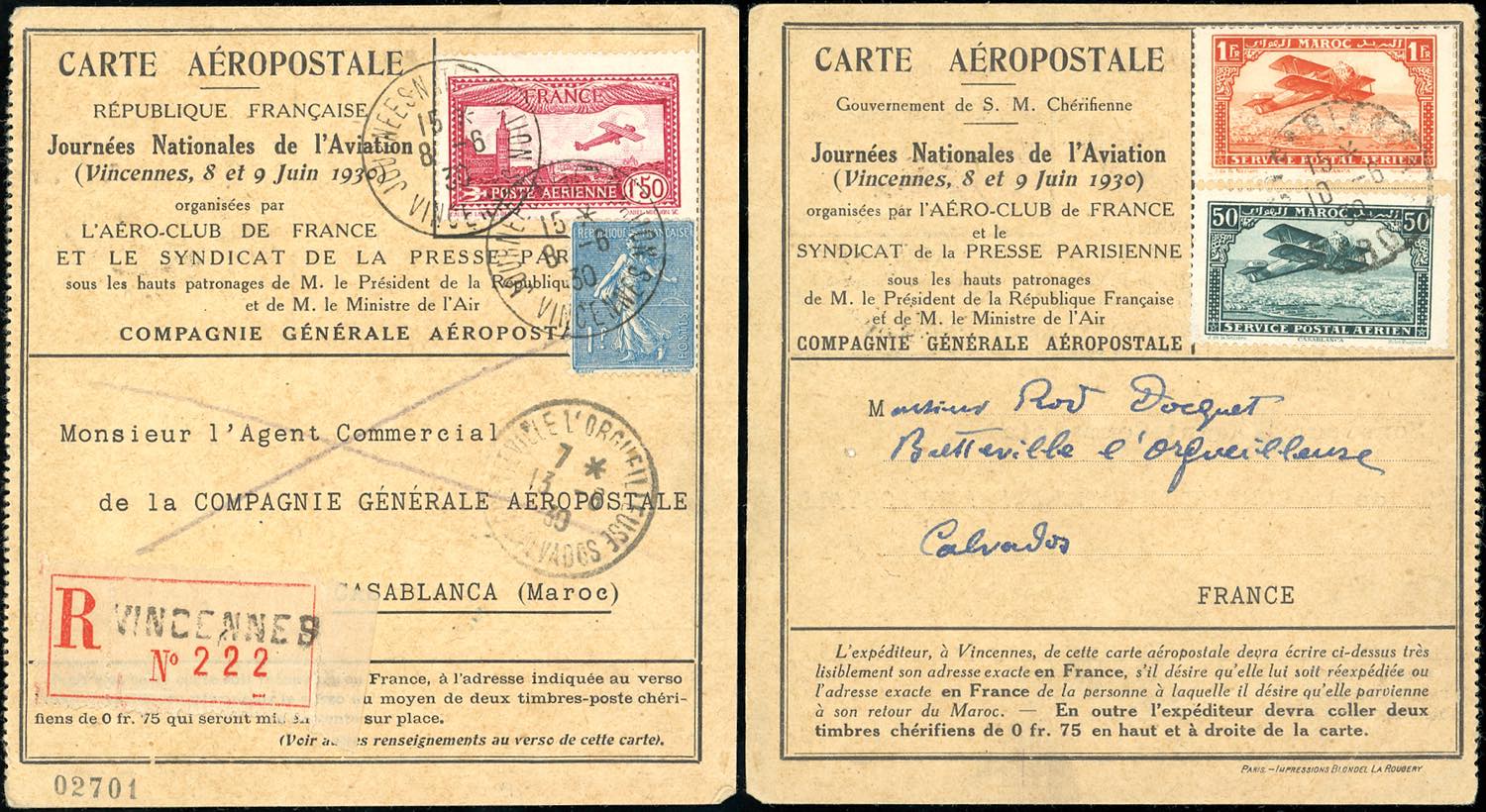 FRANCIA POSTA AEREA 1930 - Carta aeropostale affrancata fronte/retro con francobolli di Francia e Marocco da Vincennes 8/6/1930 a Casablanca 10/6/1930. Interessante.
