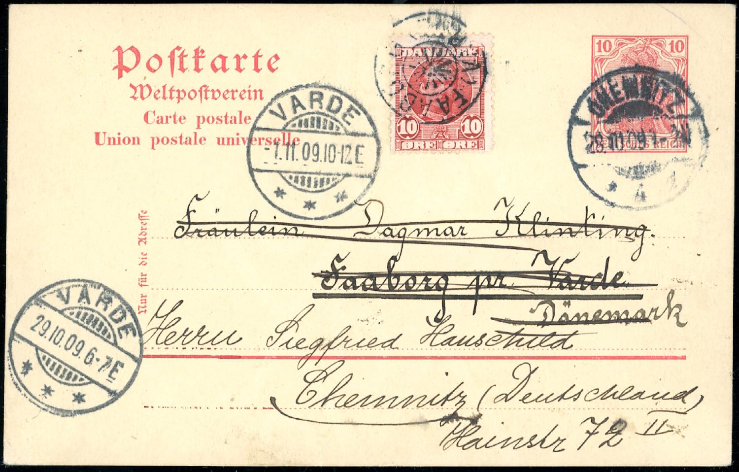 GERMANIA/DANIMARCA 1909 - Redirected with additional franking.