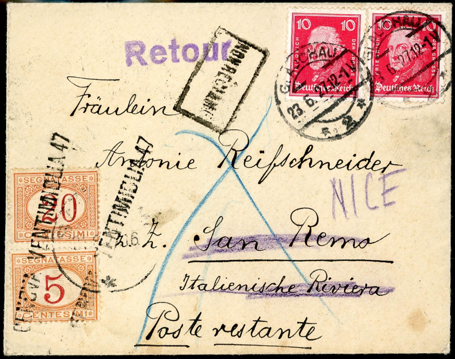 Lotto 2452 - GERMANIA/ITALIA/FRANCIA 1927 - Redirected with postage due.