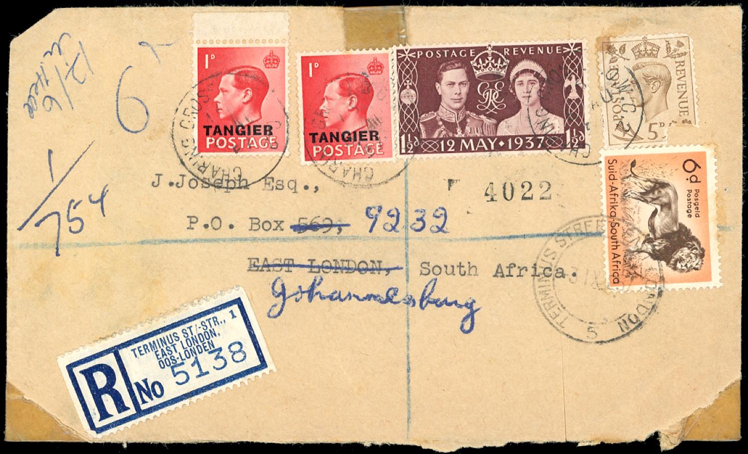 GRAN BRETAGNA TANGIER/SOUTH AFRICA 1957 - Redirected with additional franking.