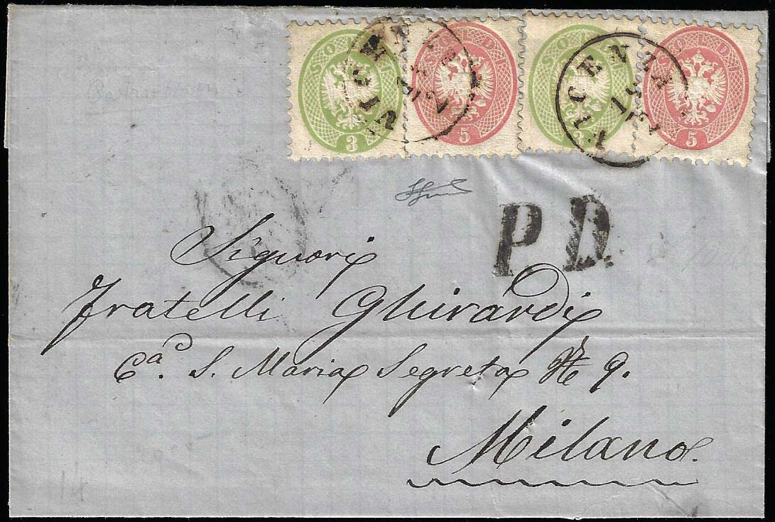 1865 - 3 soldi e 5 soldi, due esemplari, tutti dent. 9 1/2 (42,43), perfetti, su lettera da Vicenza 18/2/1865 a Milano, bollo P.D. Bella affrancatura a bandiera. Ferrario.