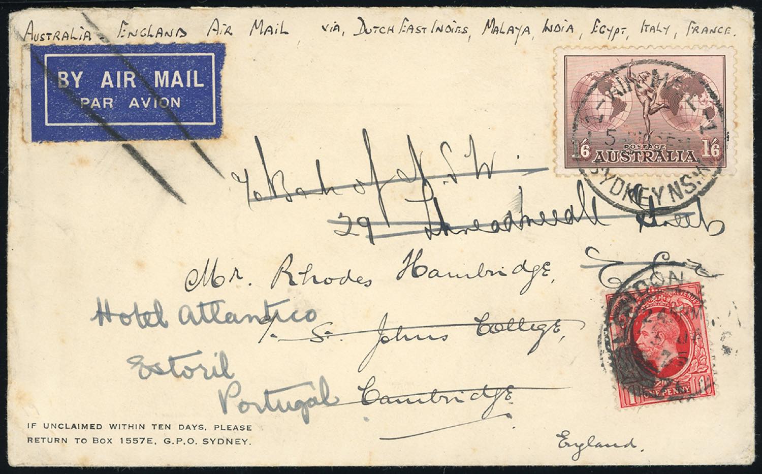 AUSTRALIA/GRAN BRETAGNA/PORTOGALLO 1935 - Redirected with additional franking.