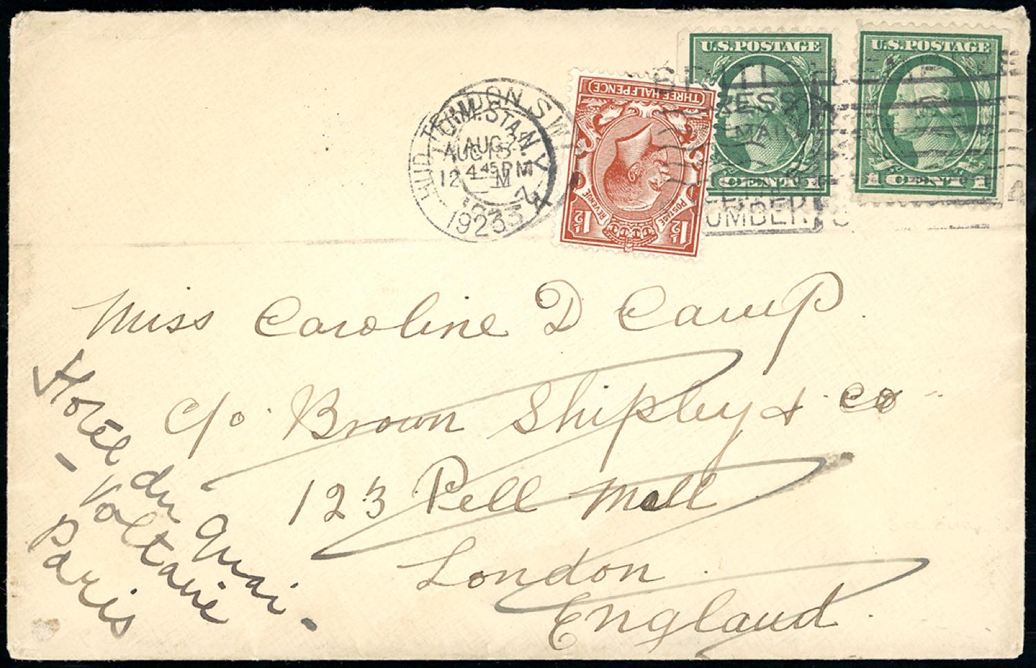 STATI UNITI D'AMERICA/GRAN BRETAGNA/FRANCIA 1923 - Redirected with additional franking.