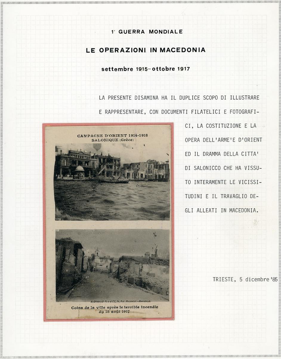 REGNO D'ITALIA POSTA MILITARE 1914/1919 - Collezione specializzata, montata in ventiquattro fogli da esposizione sulla Armee d'Orient e le operazioni militari in Macedonia. Sono presenti circa quaranta cartoline, principalmente viaggiate, molte raffiguranti le operazioni militari dell'armata e la devastazione della citta di Salonicco. Per specialista, merita esame.