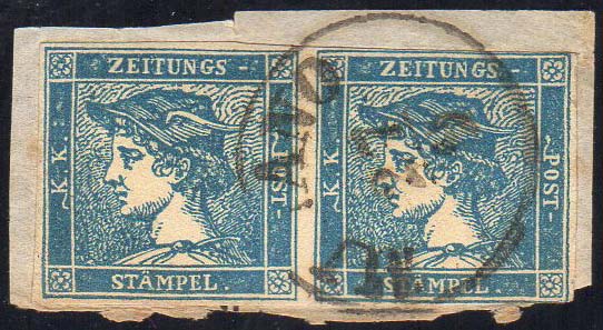 1851 - 3 cent. Mercurio azzurro, I tipo (1), coppia orizzontale, ottimo stato, usato su piccolo frammento a Milano. E.Diena.