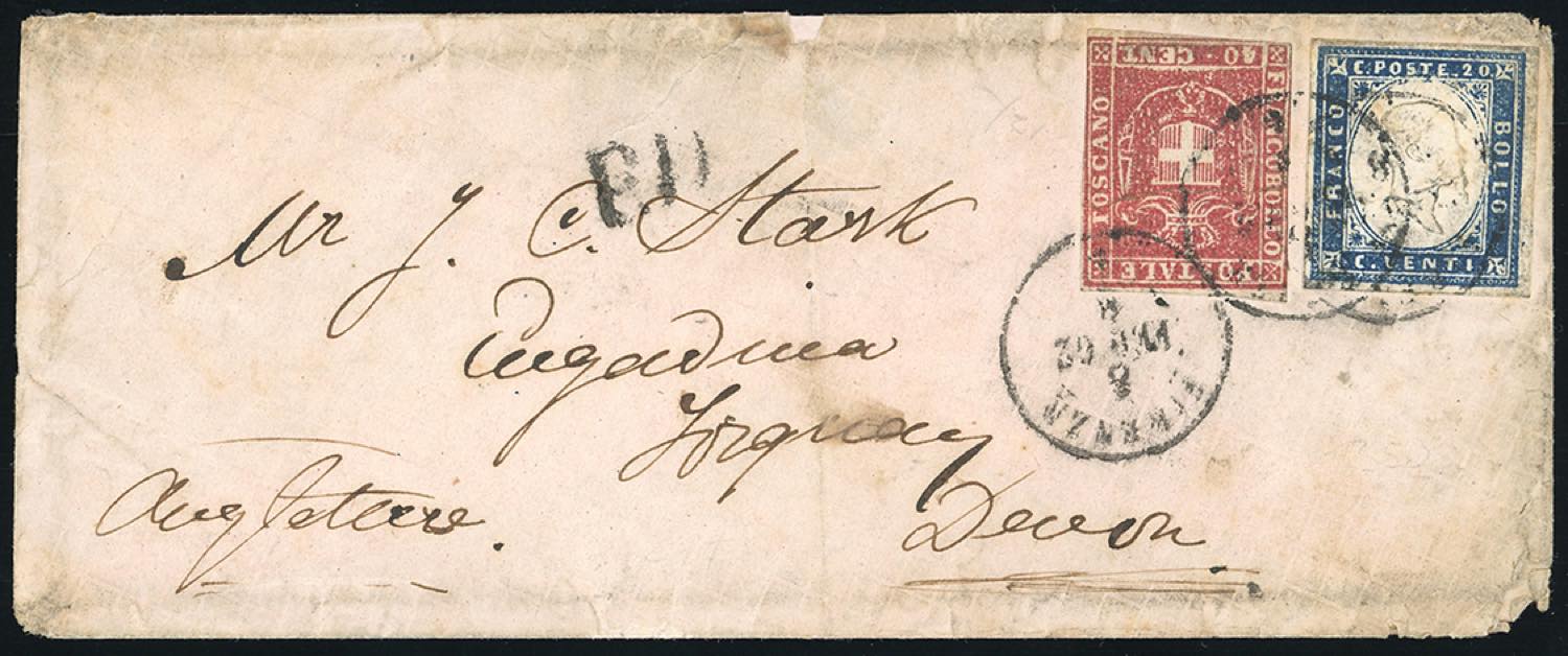 TOSCANA GOVERNO PROVVISORIO-GRAN BRETAGNA 1862 - 40 cent. carminio (21), in affrancatura mista con 20 cent. IV emisisone di Sardegna (15C), ... Leggi tutto