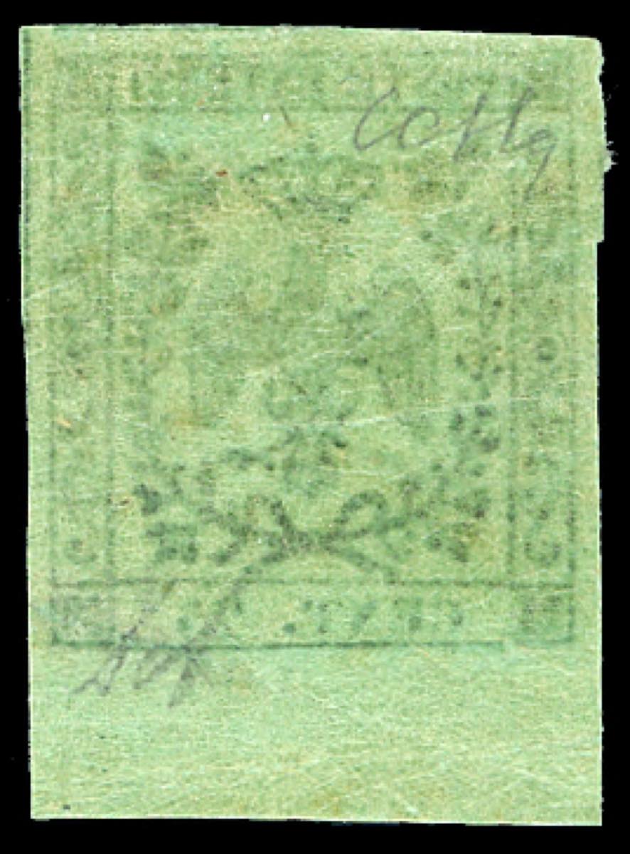 1852 - 25 cent. verde, errore di colore (4A), bordo di foglio in basso, gomma originale integra, perfetto. Splendido e raro. A.Diena, cert. Colla.