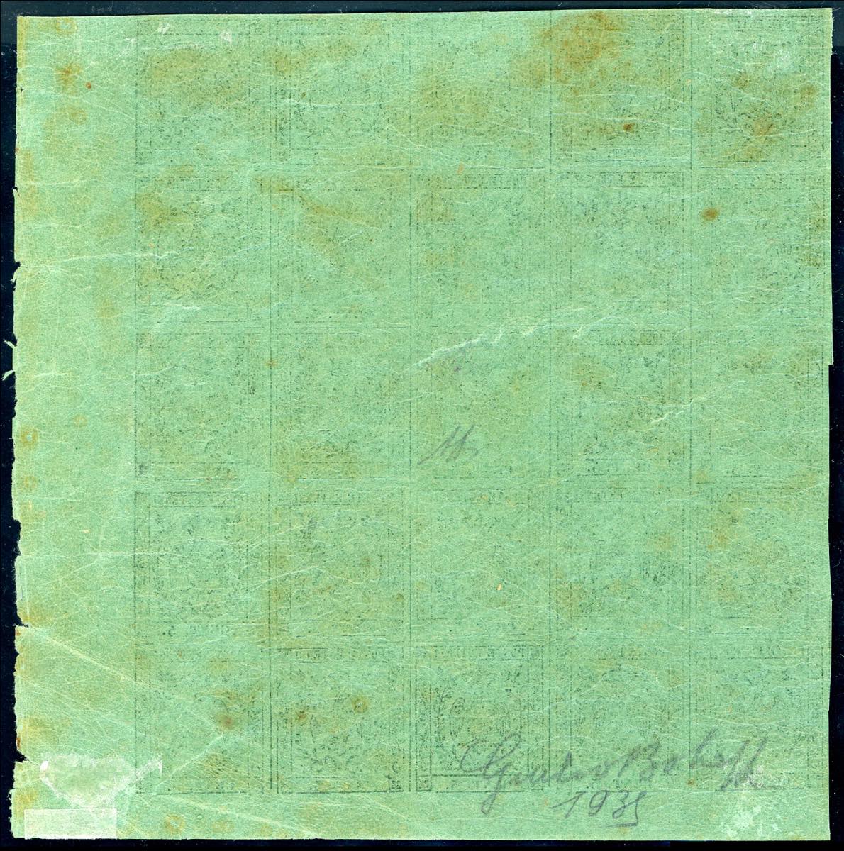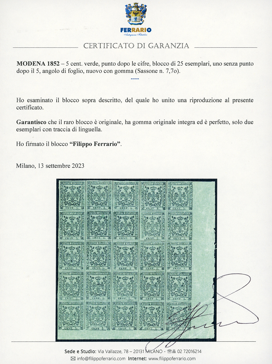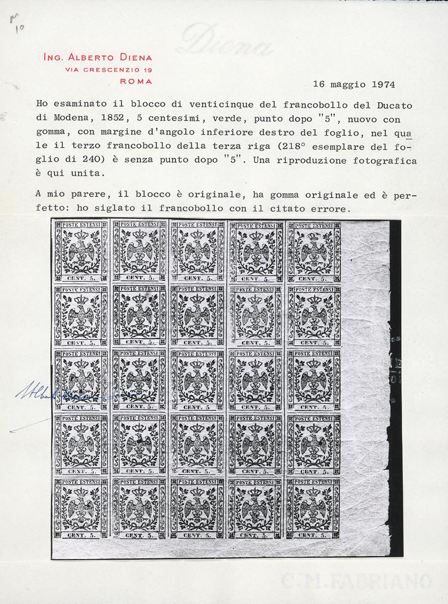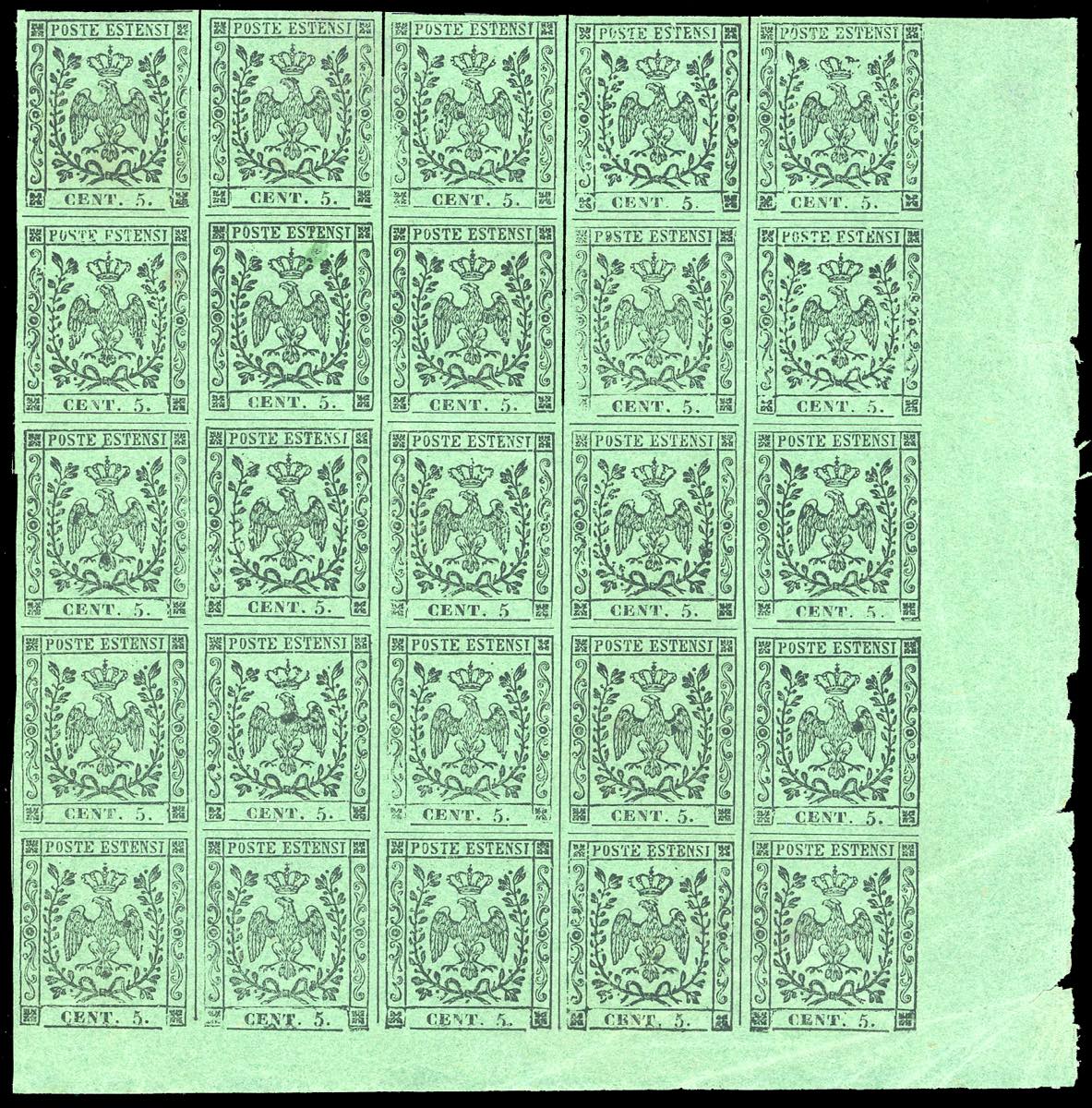 1852 - 5 cent. verde, punto dopo le cifre (7), blocco di 25 esemplari, uno senza punto dopo il 5 (7o), angolo di foglio, gomma originale integra, solo due esemplari con traccia di linguella, perfetto e di ottima qualità. Giulio Bolaffi, cert. A.Diena.