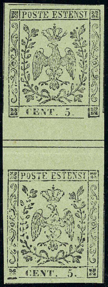 1855 - 5 cent. verde oliva (8), coppia verticale con interspazio di gruppo al centro, gomma integra, perfetta. Molto fresca. R.Diena.