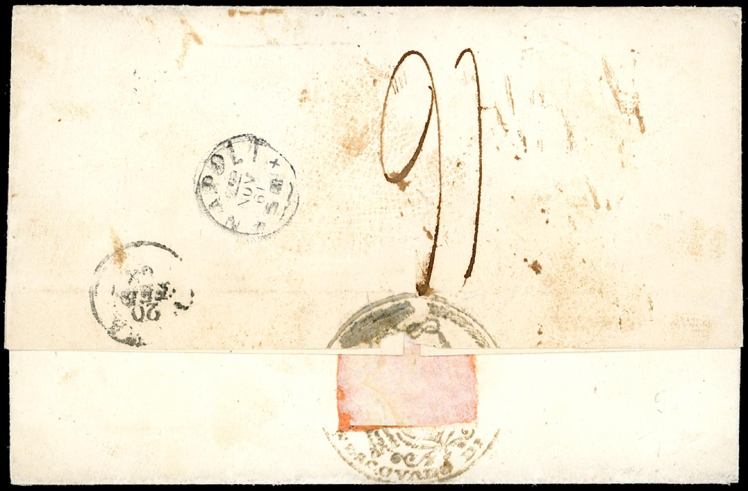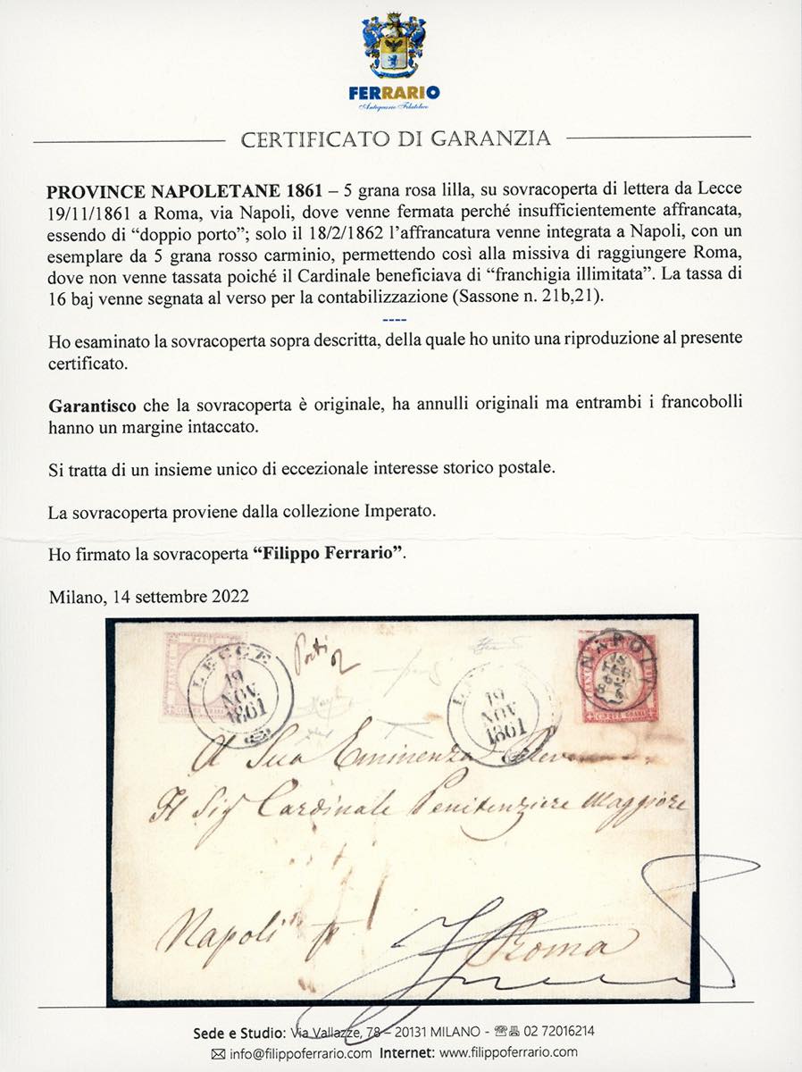1861 - 5 grana rosa lilla (21b), leggermente intaccato in alto, su sovracoperta di lettera da Lecce 19/11/1861 a Roma, via di Napoli, dove la lettera venne fermata perche insufficientemente affrancata, essendo di doppio porto. Solo il 18/2/1862 (dopo ben tre mesi!) l'affrancatura venne integrata a Napoli mediante un 5 grana rosso carminio (21) intaccato in basso, e la lettera giunse finalmente a Roma, dove non venne tassata in quanto il destinatario godeva di franchigia illimitata (la tassa di 16 baj venne segnata al verso per la contabilizzazione, ma non richiesta al Cardinale). INSIEME UNICO, di eccezionale interesse storico postale. Bottacchi, Raybaudi, Chiavarello, Fiecchi, cert. Ferrario. Ex coll. Imperato.