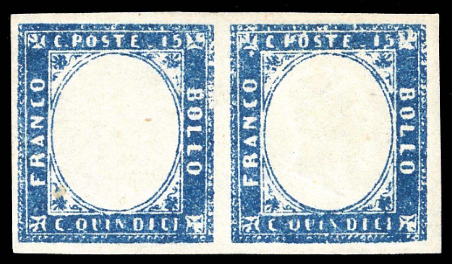 1863 - 15 cent. azzurro tipo Sardegna, coppia orizzontale, il primo esemplare senza effigie (11n), gomma originale, perfetta. A.Diena, G.Oliva, cert. Caffaz.