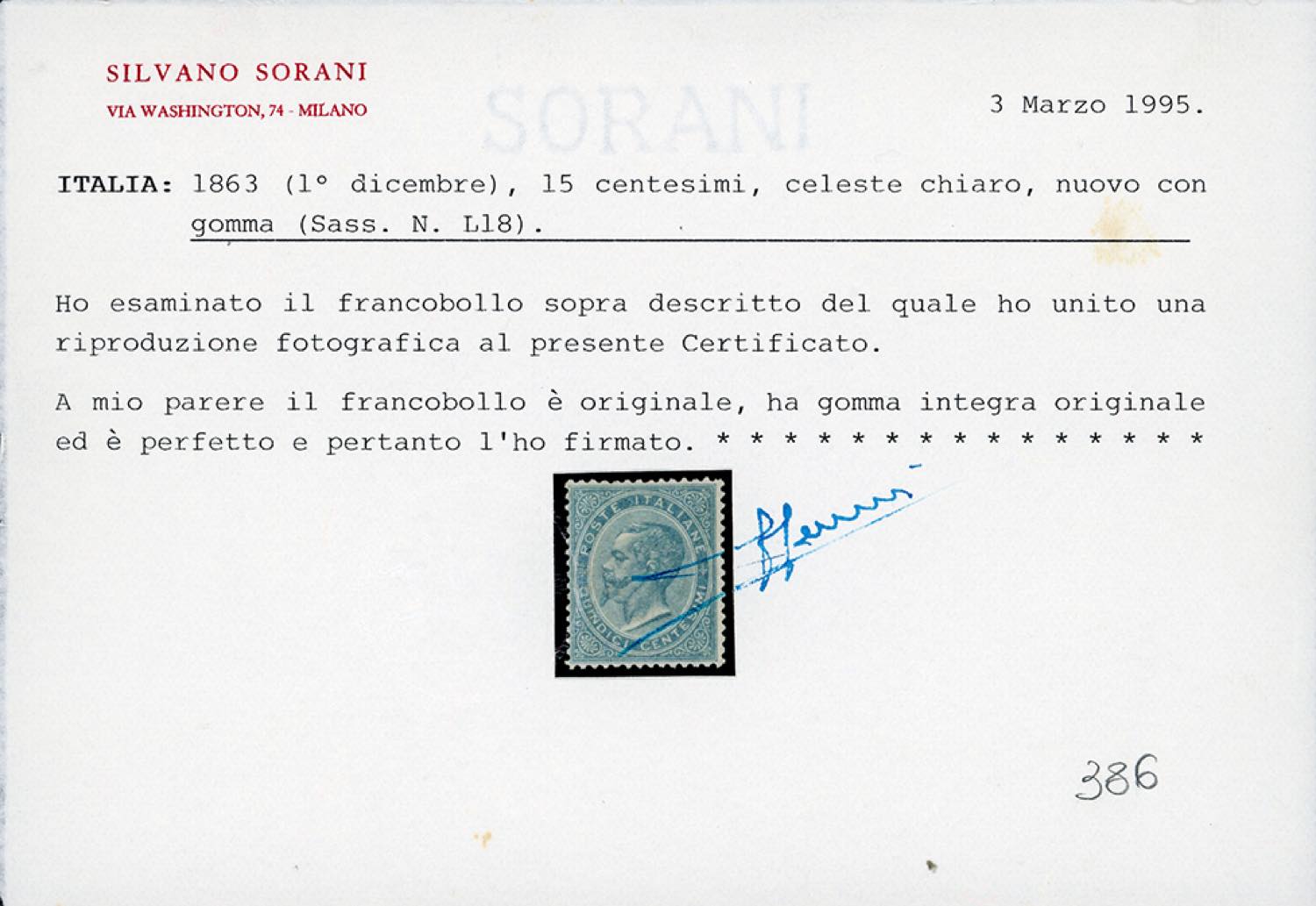 1863 - 15 cent. De La Rue (L18), buona centratura, gomma originale integra, perfetto. Cert. Sorani.