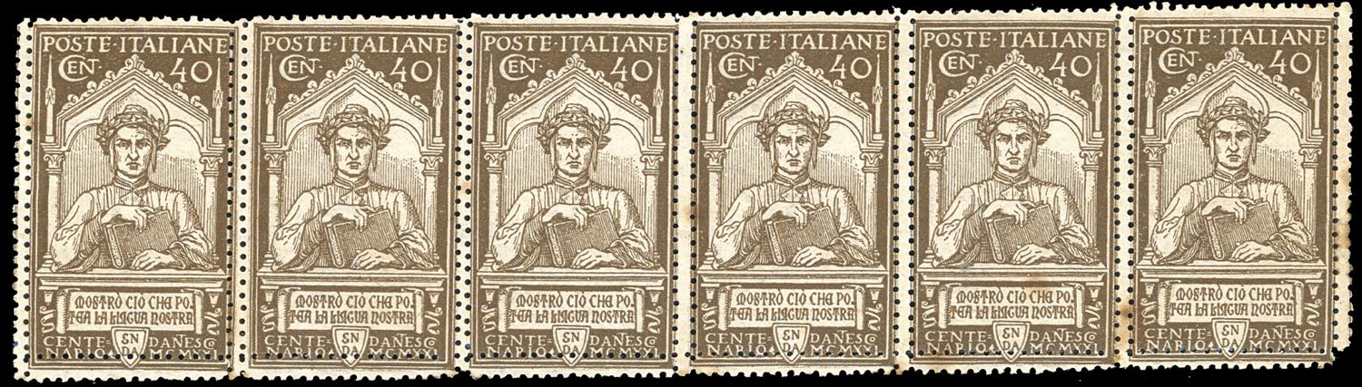 1921 - 40 cent. Dante (118), doppia dentellatura verticale e in basso, striscia orizzontale di 6, gomma originale, integra per 4 esemplari, ... Leggi tutto