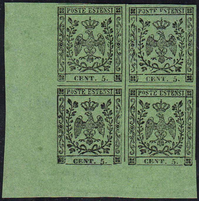 1855 - 5 cent. verde oliva (8), blocco di quattro angolo di foglio, gomma originale integra, perfetto. Splendido e raro. Cert. Diena.