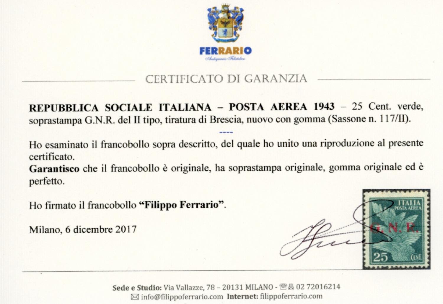 1943 - 25 cent. soprastampa G.N.R. di Brescia, II tipo (117/II), nuovo, gomma originale, perfetto. Raro. Cert. Ferrario.