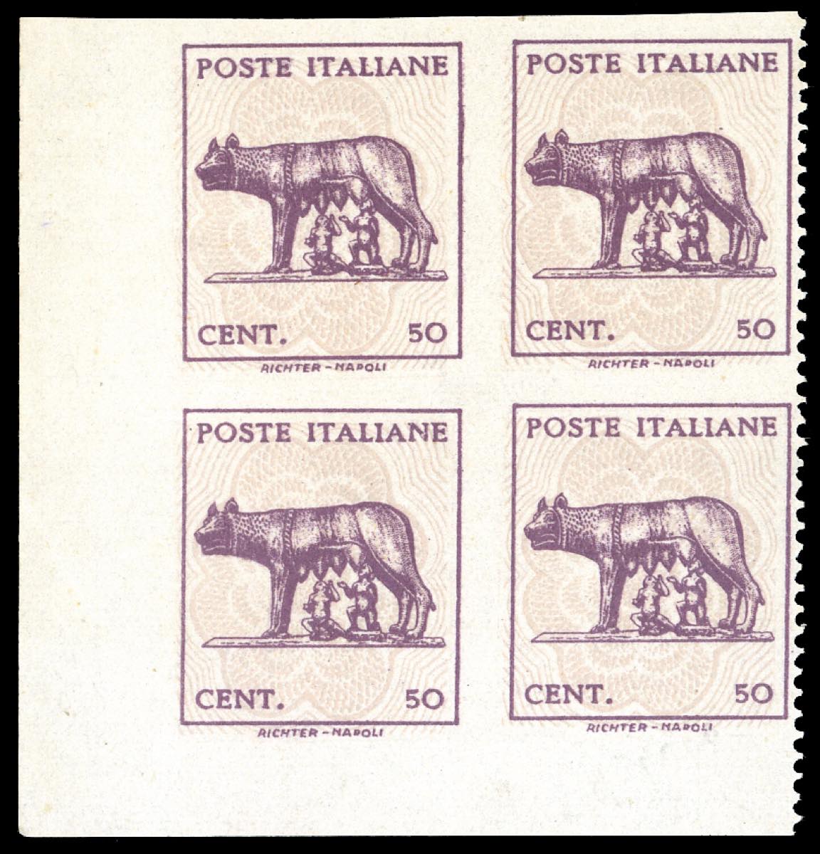 1944 - 50 cent. Lupa, senza filigrana, blocco di quattro formato da due coppie orizzontali con l'esemplare di destra dentellato solo a ... Leggi tutto