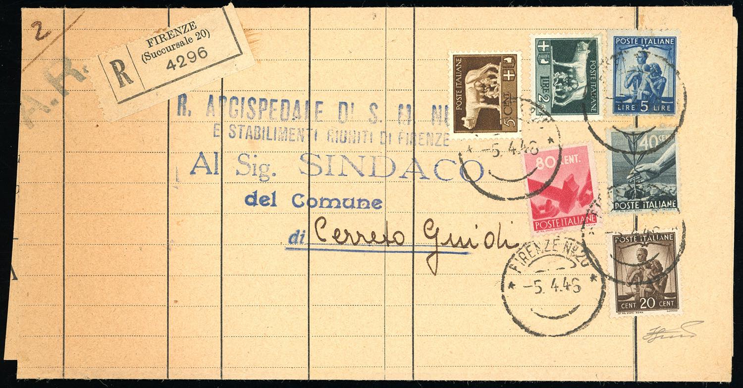 1946 - 20 cent., 40 cent., 80 cent., 5 lire Democratica, in affrancatura mista con 5 cent. e 2,55 lire Imperiale (544,546,555,Regno 243,256), perfetti, su piego raccomandato da Firenze 5/4/1946 a Cerreto Guidi. Pregevole affrancatura "sei colori", di ottima qualità. Ferrario.