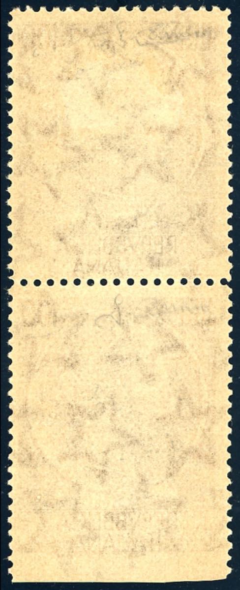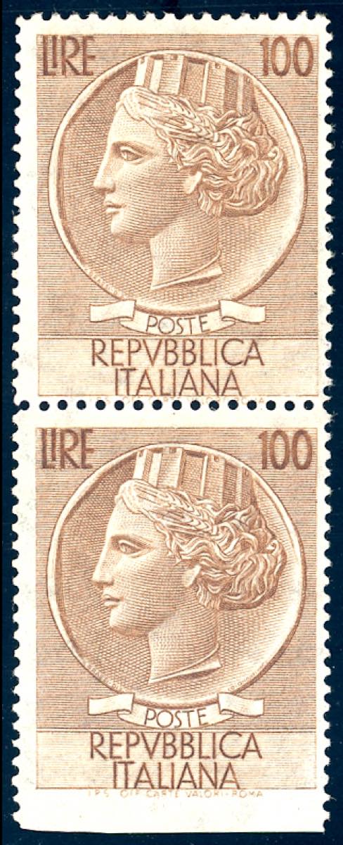 1955 - 100 lire Turrita, dent. 13 1/4 x 14, coppia verticale, l'esemplare inferiore non dentellato in basso (785/IIIc,785/III), gomma originale integra, perfetta. Rara. Carraro.