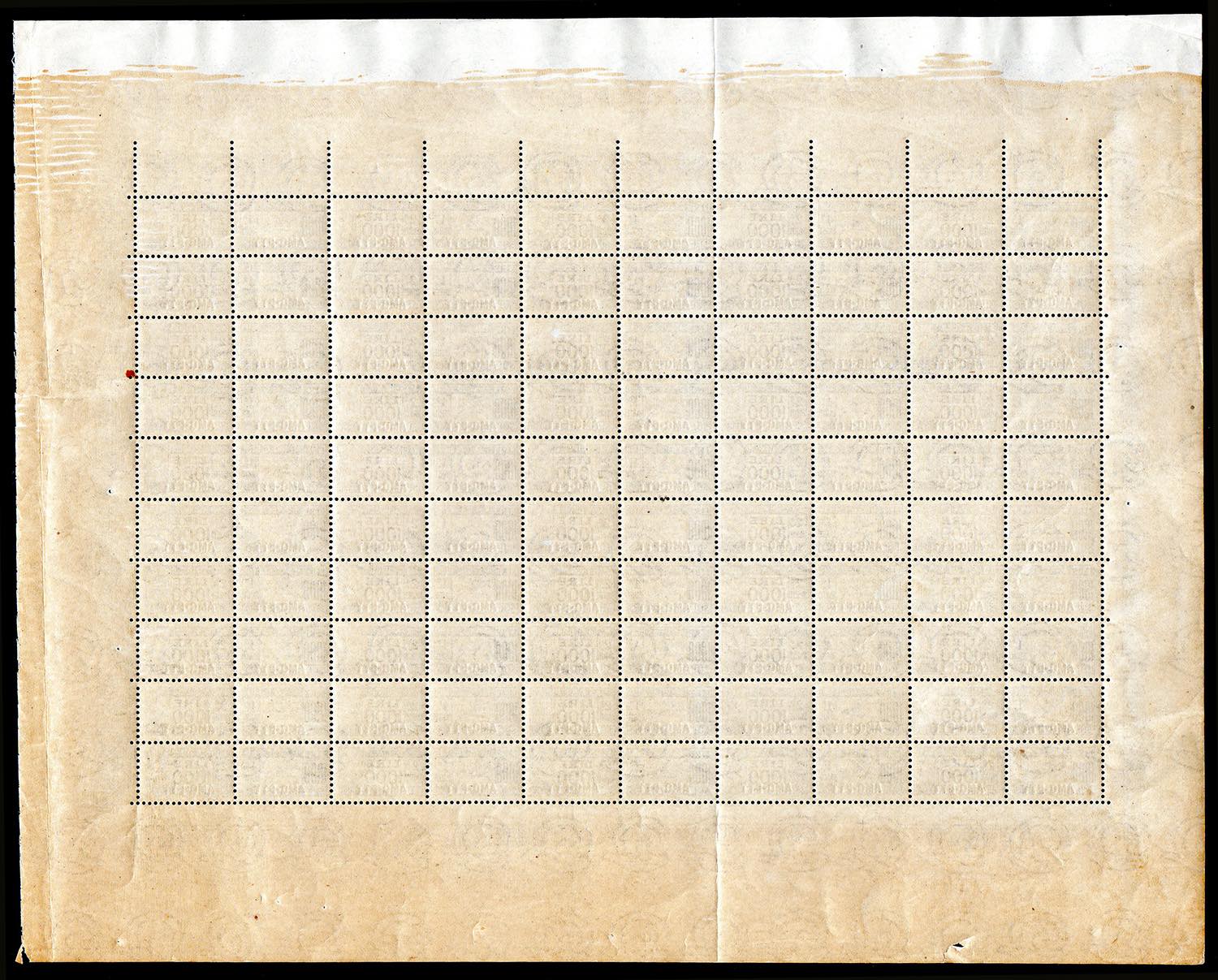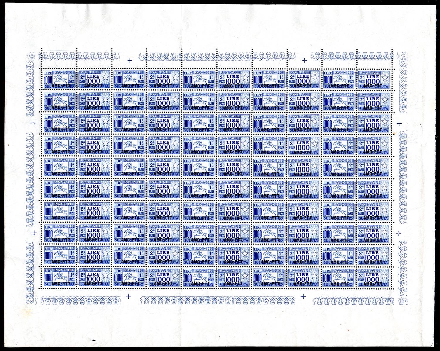 PACCHI POSTALI 1954 - 1.000 lire Cavallino, soprastampato, dentellatura a pettine (26), foglio completo di 50 esemplari, gomma originale ... Leggi tutto
