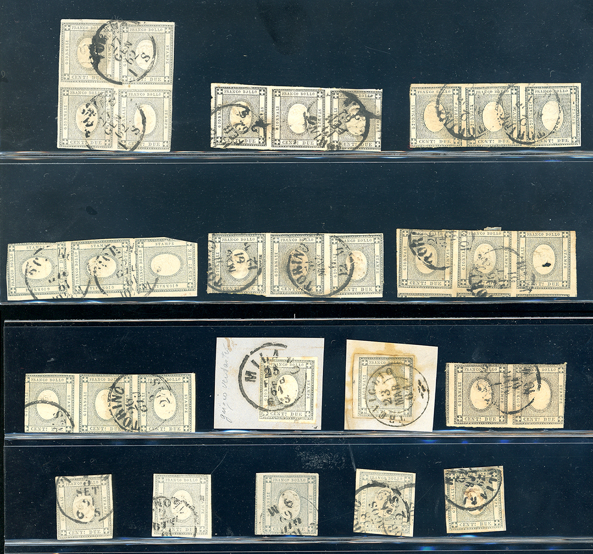 SARDEGNA 1861/1863 - 2 cent. francobollo per stampati (20), un blocco di quattro, sei strisce di tre, una coppia e sette esemplari, tutti usati, annulli originali, qualità mista.