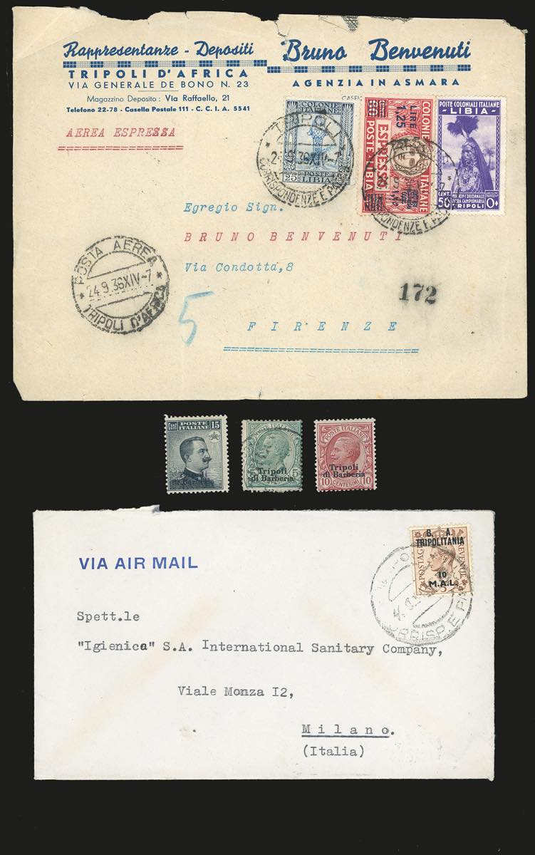 LIBIA TRIPOLI 1918/1954 - Dieci buste/cartoline affrancate del periodo con annulli di Tripoli. Uniti tre francobolli dell'Ufficio di Tripoli di Barberia.