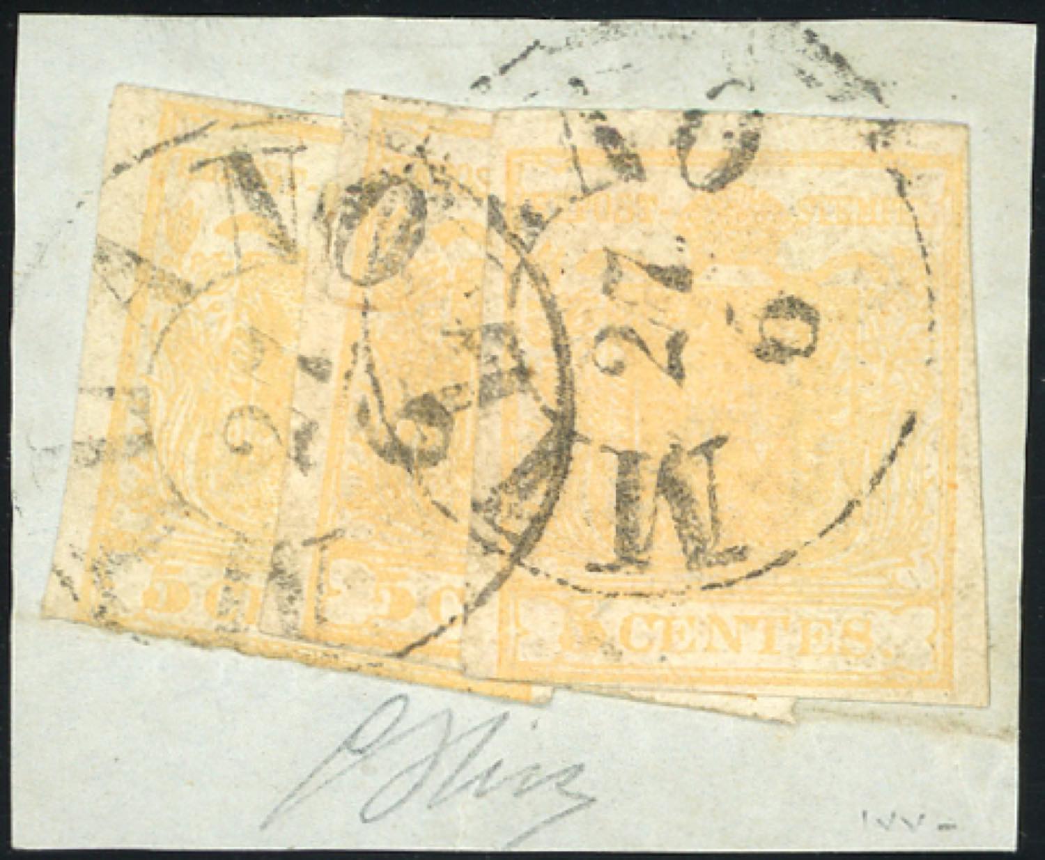1850 - 5 cent. giallo ocra (1), tre esemplari usati a Milano su frammento, sovrapposti alla maniera austriaca (treppenfrankatur). Insieme ... Leggi tutto