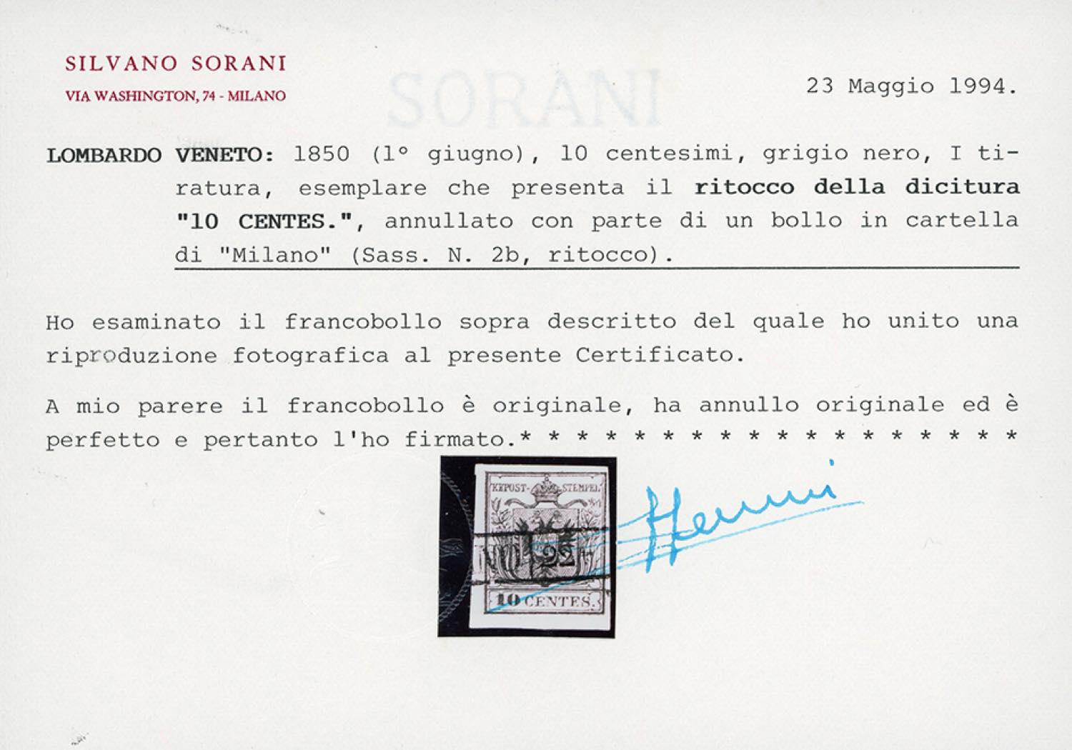 1850 - 10 cent. grigio nero, I tiratura, ritocco della dicitura "centes" (2b/k), perfetto, usato a Milano. Varietà molto rara, specie negli esemplari della I tiratura. Cert. Sorani e Fiecchi. (cat.Sassone € 12.000 in proporzione).