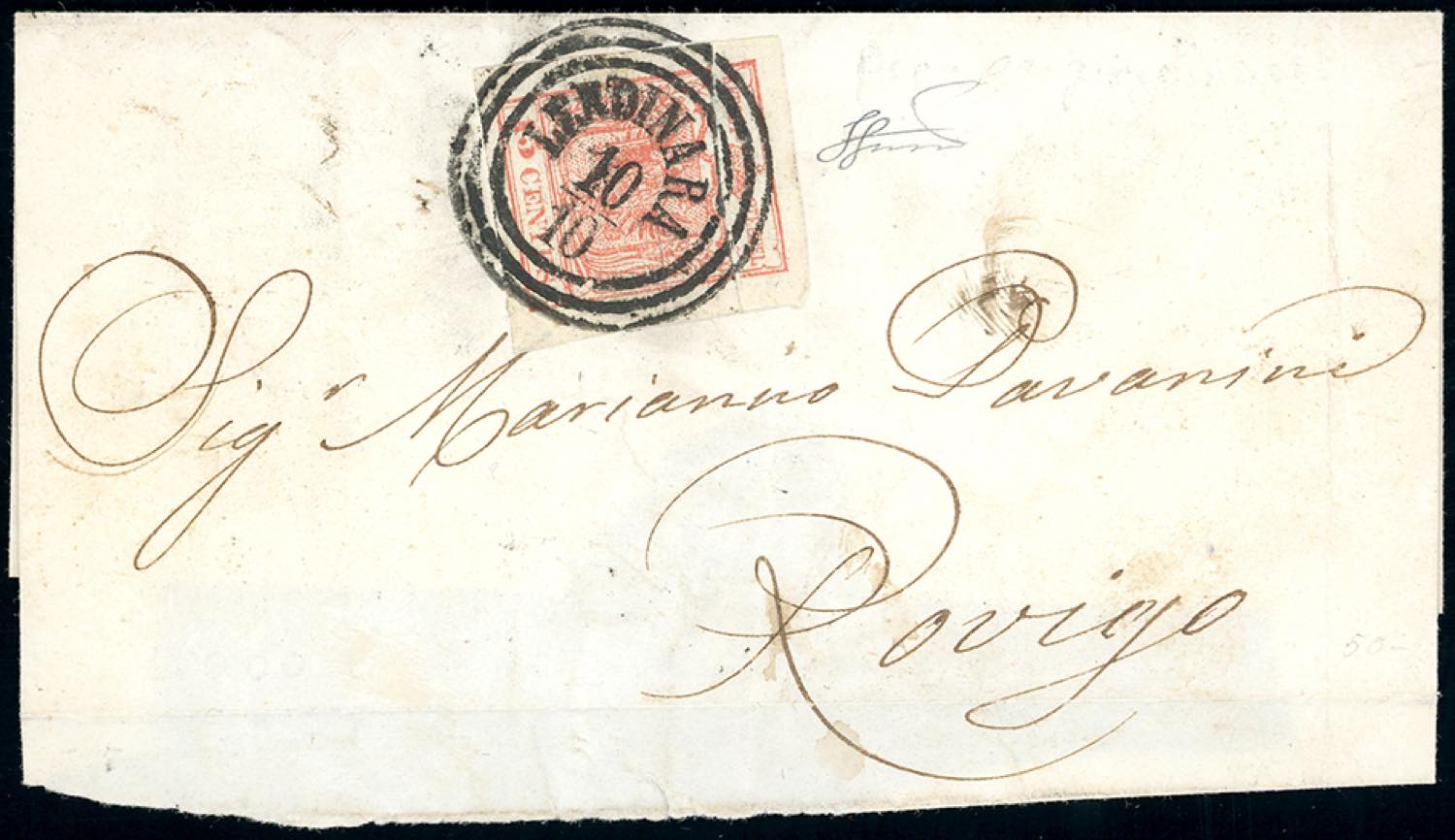 1852 - 15 cent. rosso, III tipo, carta a mano (6), pli d'accordeon, perfetto e ben marginato su frontespizio di lettera con parte del verso e bollo d'arrivo da Lendinara 10/10 a Rovigo. Interessante e non comune varietà, così evidente. Ferrario.