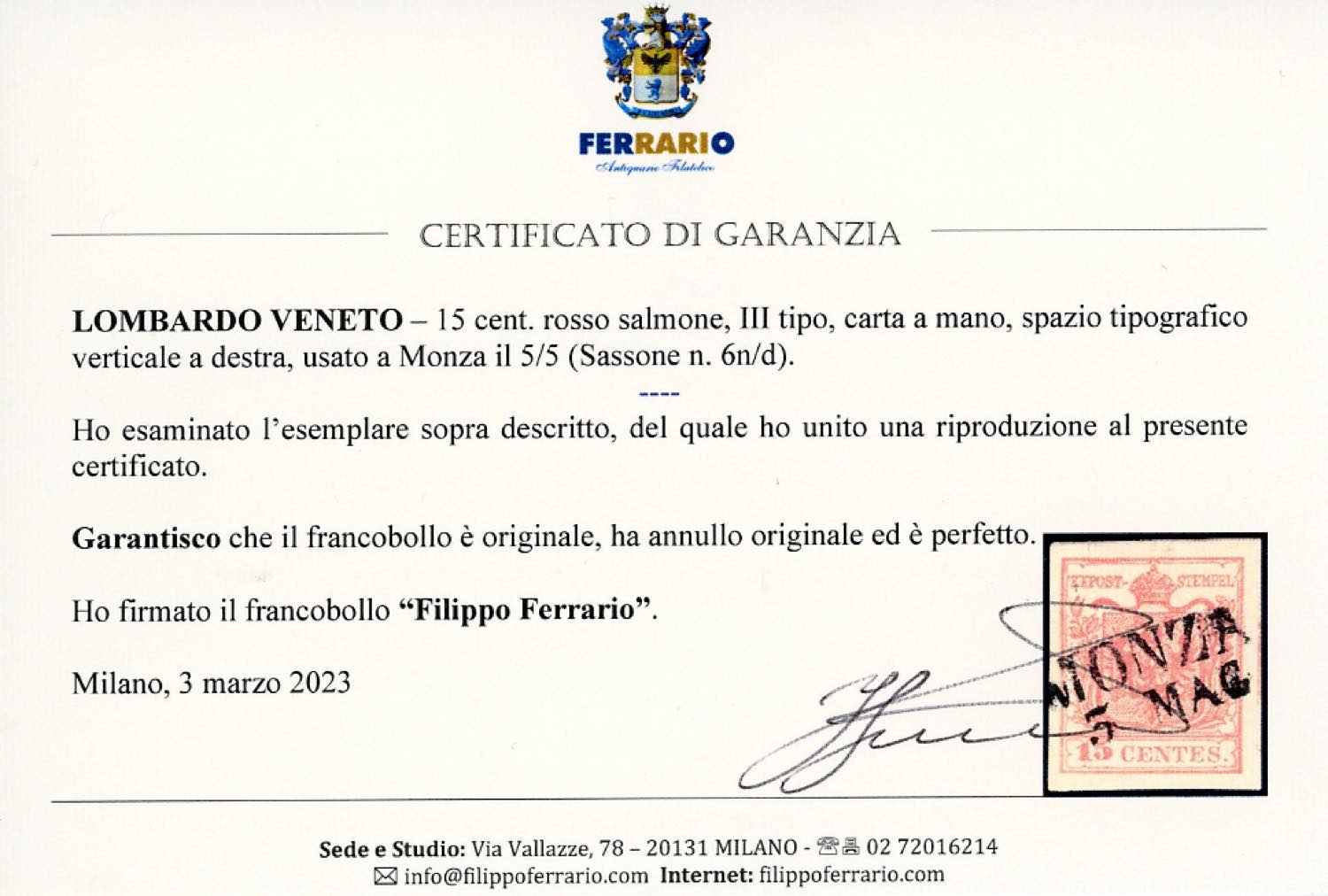 1852 - 15 cent. rosso salmone, III tipo, carta a mano, SPAZIO TIPOGRAFICO VERTICALE (6n/d), perfetto, usato a Monza 5/5. Molto raro. Chiavarello, cert. Ferrario.