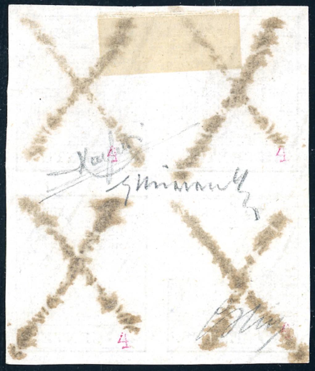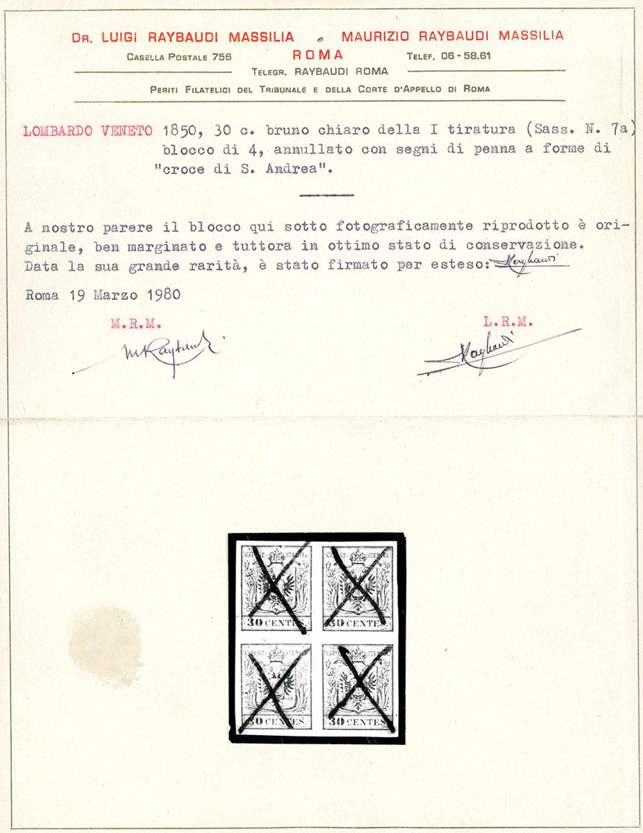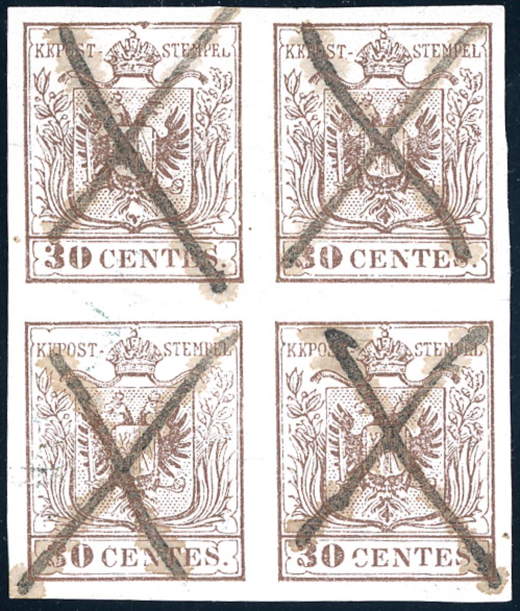 1850 - 30 cent. bruno chiaro, I tipo, carta a mano, prima tiratura (7a), blocco di quattro, perfetto e ben marginato, annullato con quattro segni di penna a forma di croce di Sant'Andrea. Il blocco proviene dal foglio inizialmente completo di 240 esemplari ora conservato al museo postale di Vienna. Si conoscono solo altri due blocchi di quattro ed un blocco di otto (tutti annullati con le croci di S.Andrea) in collezioni private. Importante rarità della I emissione, da esposizione. G.Oliva, Chiavarello, cert. Raybaudi.