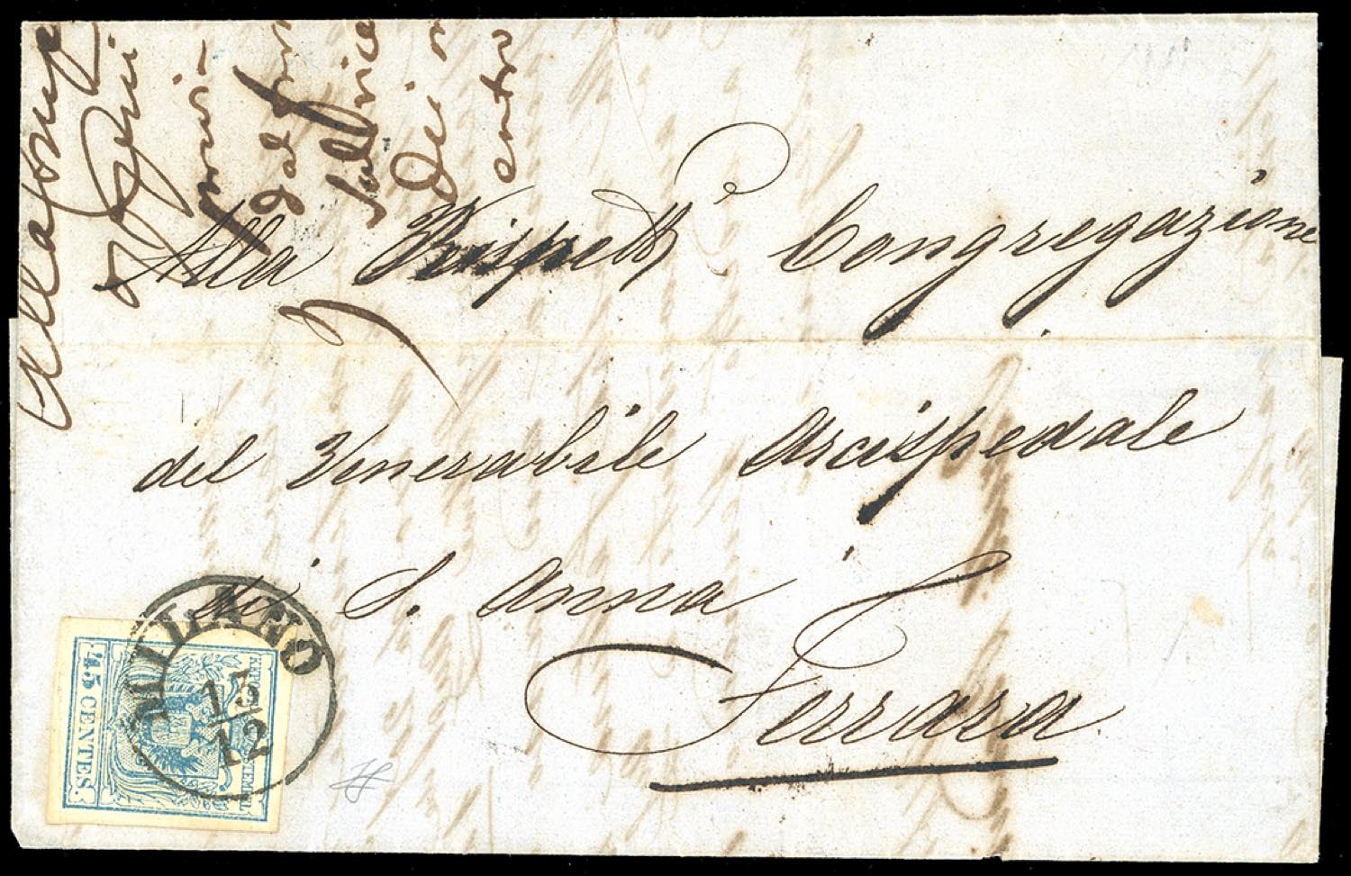 1857 - 45 cent. azzurro, carta a macchina (22), perfetto e ben marginato, su lettera da Milano 15/12/1857 a Ferrara. Ferrario.