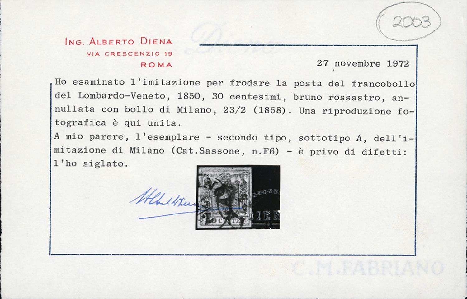 1858 - 30 cent. bruno rossastro, falso per posta di Milano, II tipo (F6), perfetto, usato a Milano 23/2. Em.Diena, G.Oliva, cert. A.Diena.