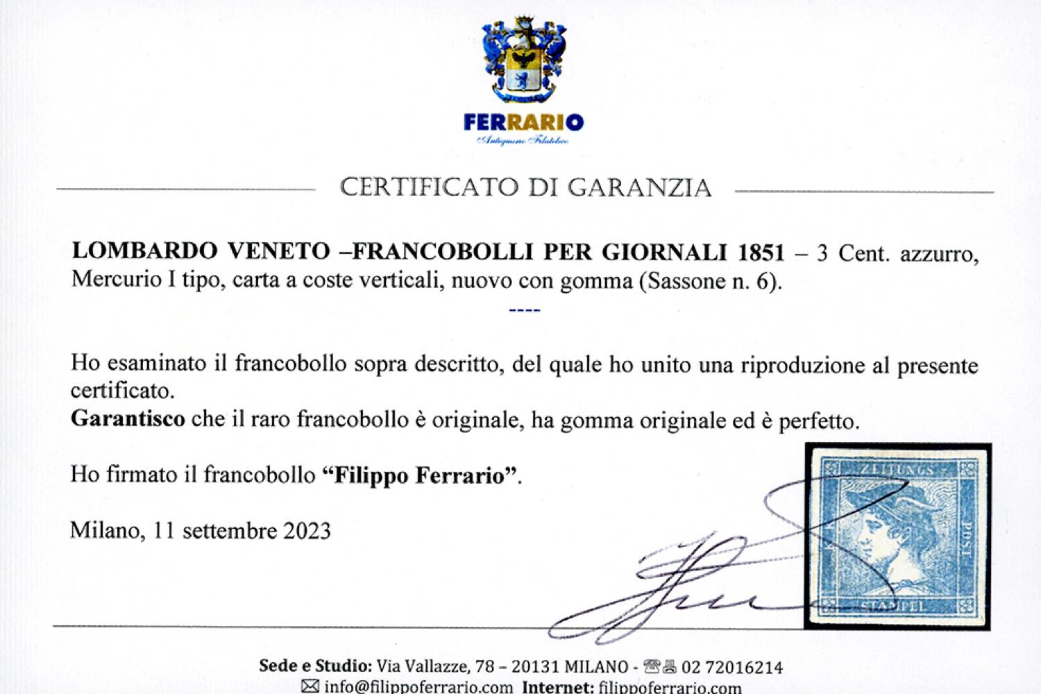 1851 - 3 cent. Mercurio azzurro, I tipo, carta a coste verticali (6), gomma originale, perfetto. Bello. A.Diena, cert. Ferrario.