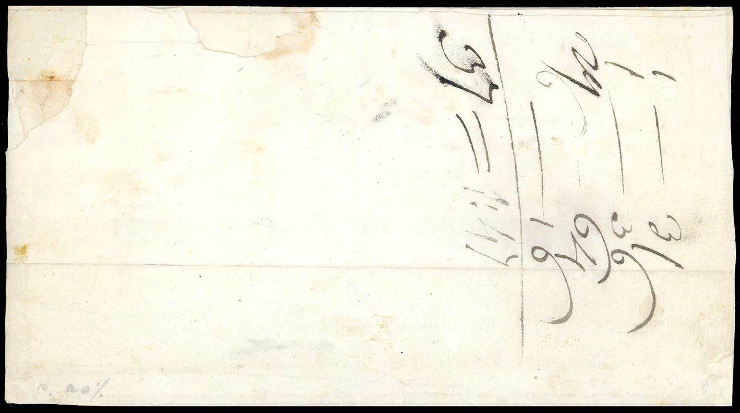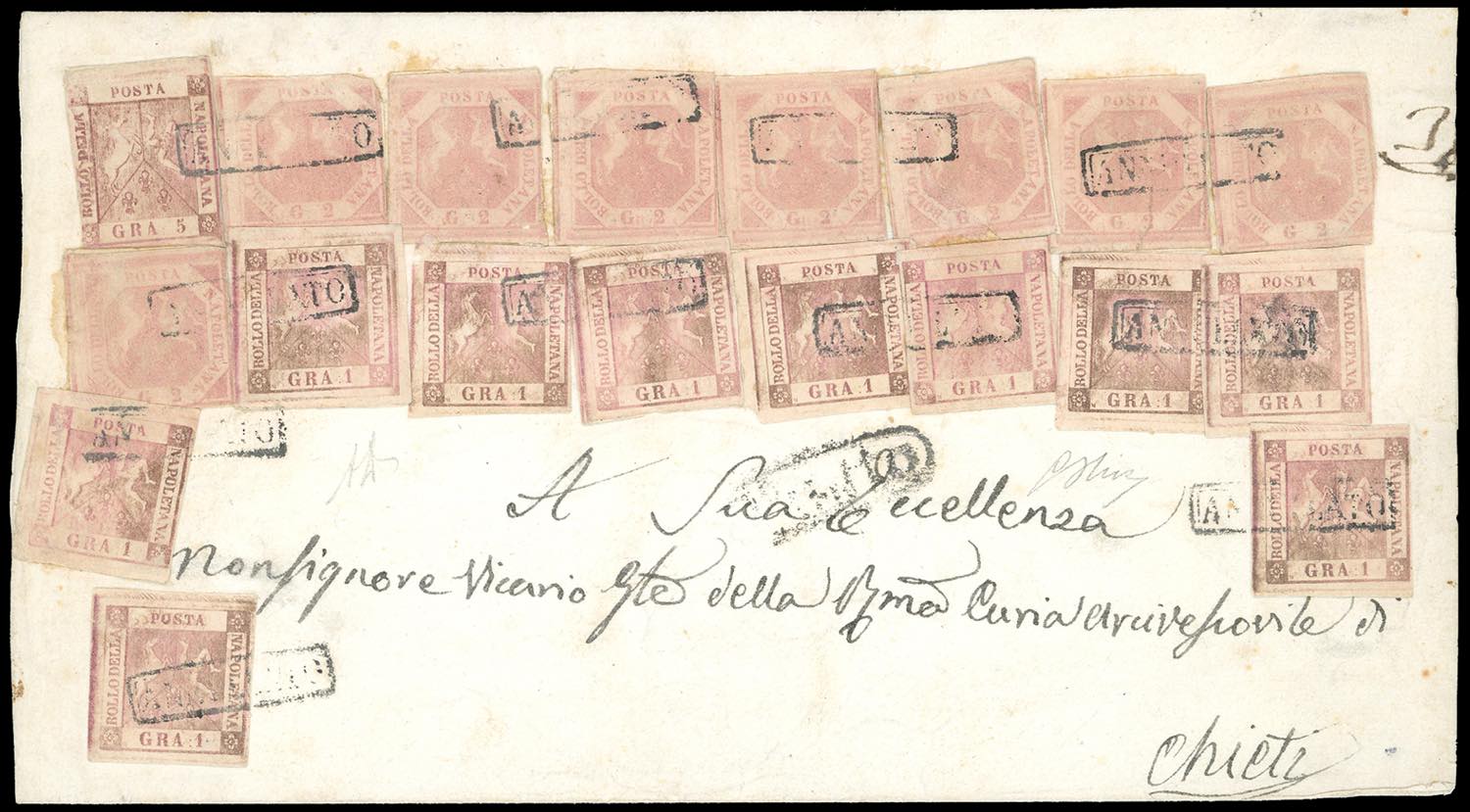 1858 - 1 grano, dieci esemplari della I e II tavola, 2 grana otto esemplari della I tavola e 5 grana I tavola (3,4,5,8), lievi difetti, su grande fascetta contenente stampati indirizzata a Chieti, probabilmente spedita da Taranto. Eccezionale affrancatura multipla di 62 porti. A.Diena, G.Oliva.