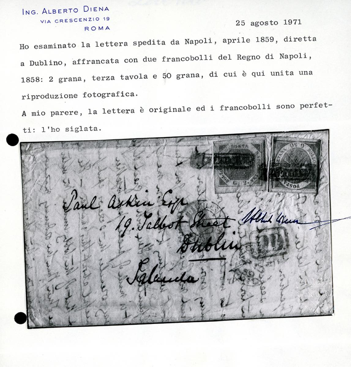 1859 - 50 grana rosa lillaceo, 2 grana rosa brunastro, III tavola (14a,7), perfetti e ben marginati, su lettera di doppio porto da Napoli 8/4/1859 a Dublino, Irlanda. Si tratta dell'UNICA LETTERA NOTA con il raro 50 grana indirizzata in Irlanda! Splendida. Emilio Diena, Chiavarello, cert. A.Diena e Ferrario. Ex coll. Imperato.