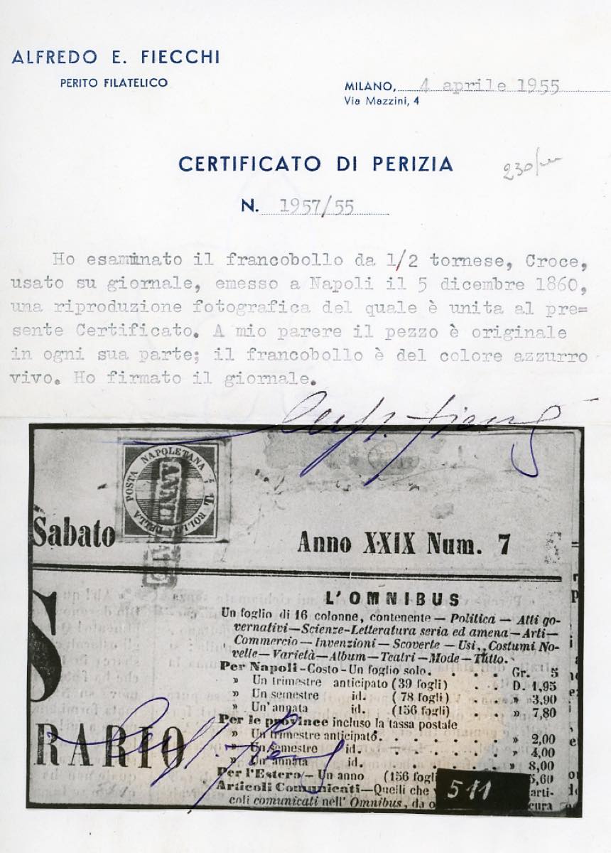 1861 - 1/2 tornese azzurro Crocetta (16), pos. 73 dello studio De Angelis-Pecchi, perfetto e ben marginato, usato su testata completa del giornale "L'Omnibus" del 15/1/1861. Mezzadri, cert. Fiecchi e Manzoni.